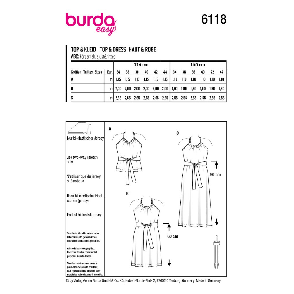 Střih ve velikostech EUR 34-44, úroveň obtížnosti šití: 1 (velmi lehká), doporučené látky: bi-elastický žerzej