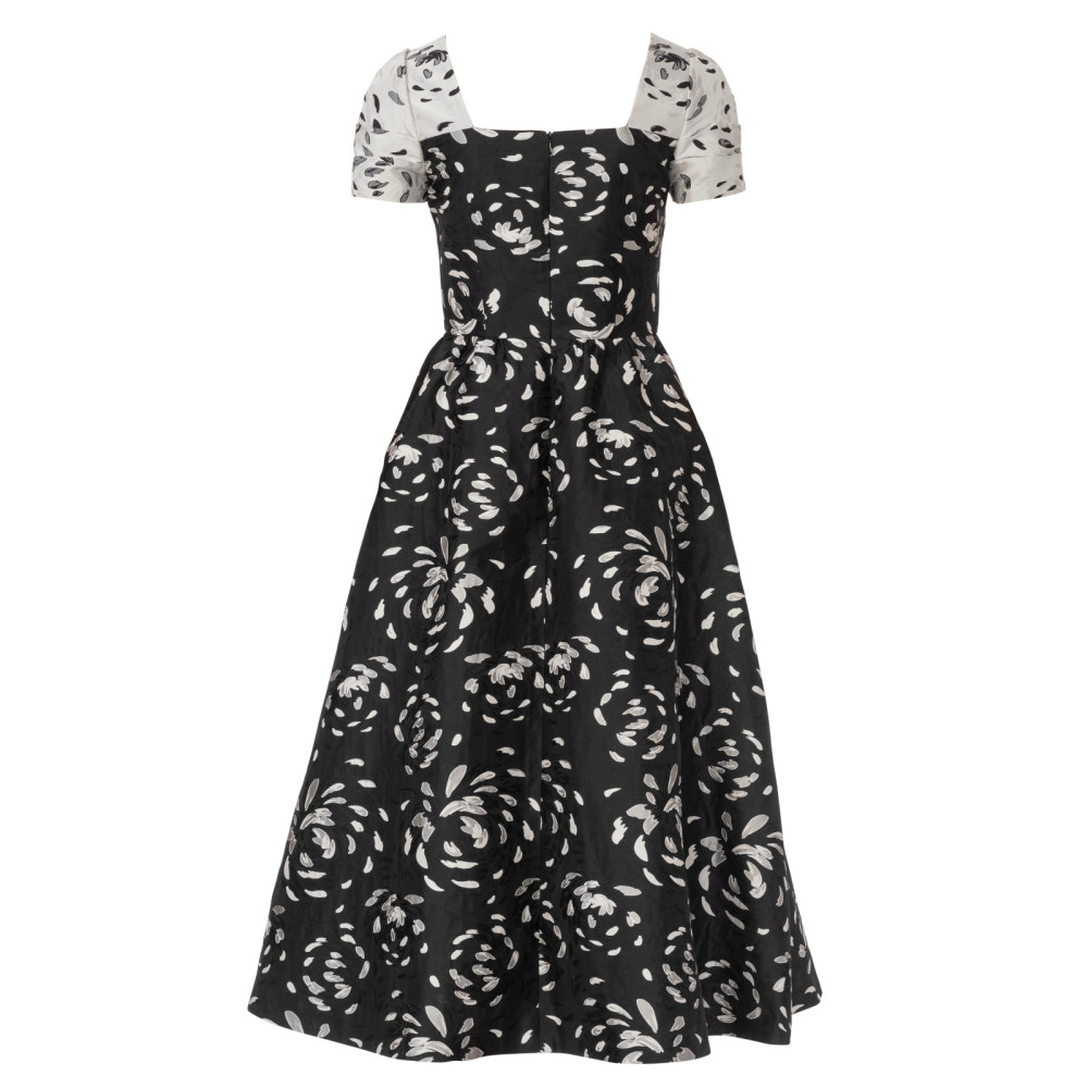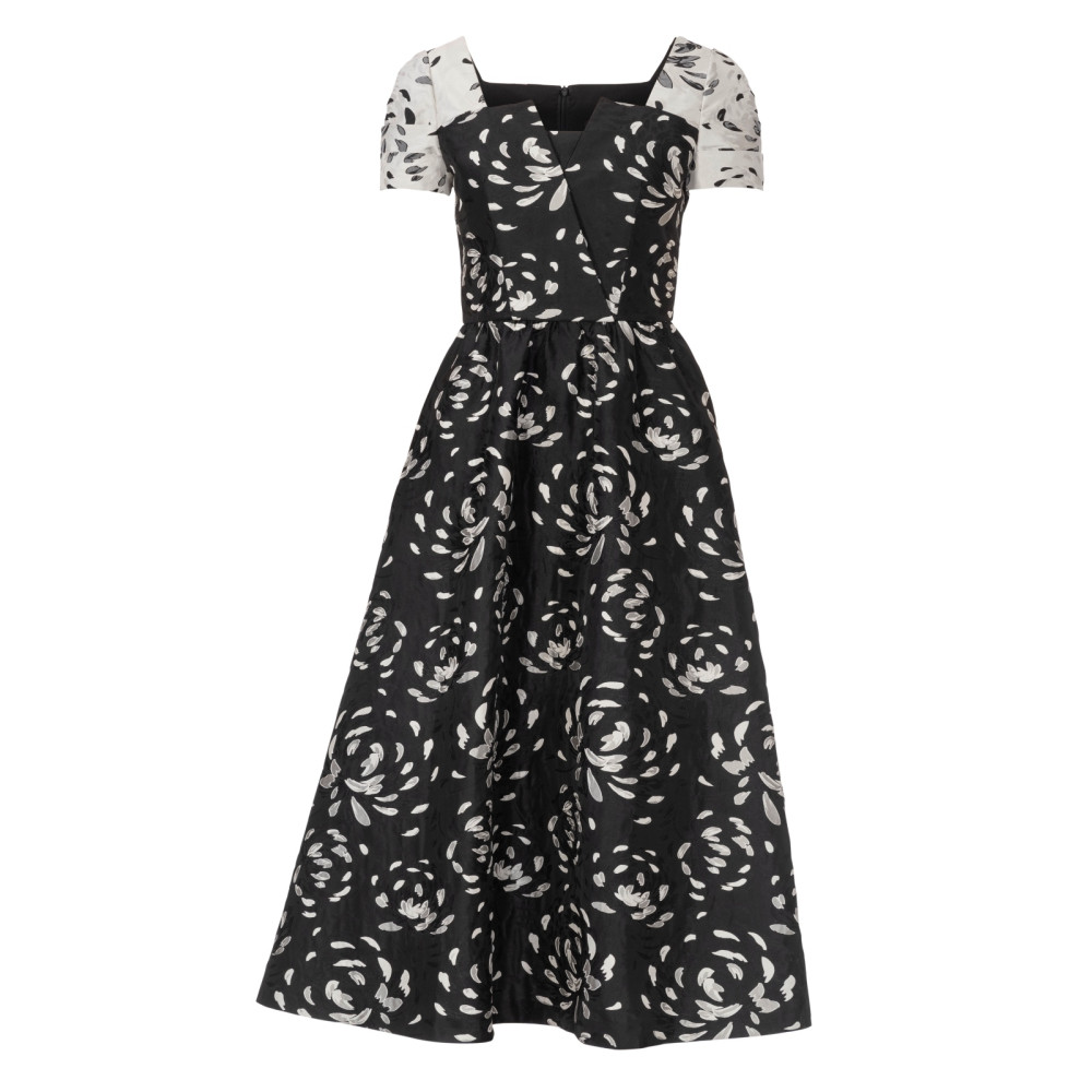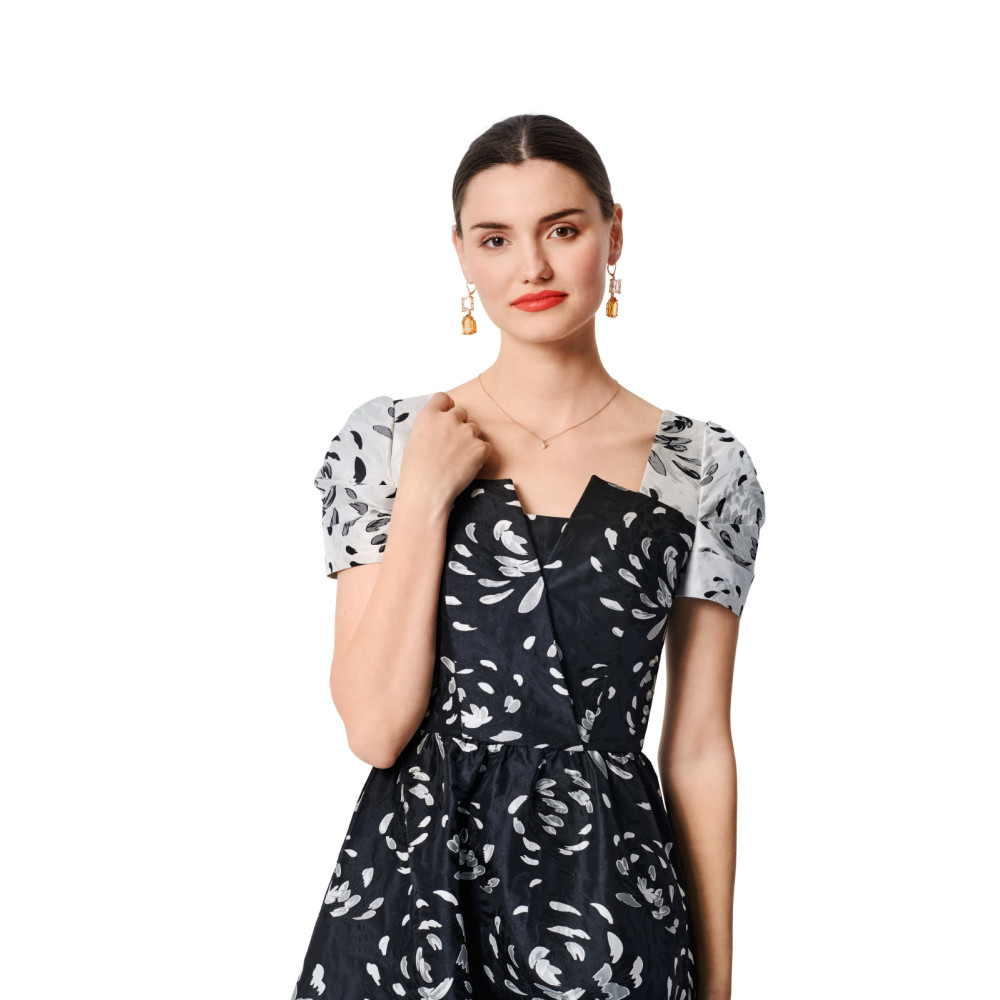 Střih ve velikostech EUR 34-44, úroveň obtížnosti šití: 3 střední info, doporučené látky: žakár, taft, duchesse