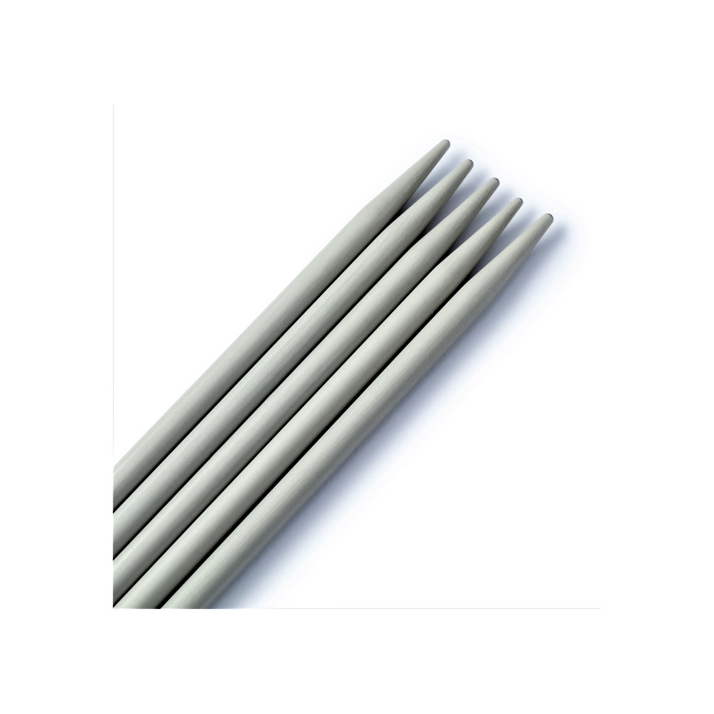 Lehké hliníkové oboustranné pletací jehlice v délce 20 cm v perlově šedé. Neporézní odolný povrch jehlic umožňuje snadné klouzání stehů po jehlicích. Zaoblená špička jehlic umožňuje nabírání stehů bez rozdělení příze. Oboustranné pletací jehlice jsou vhodné pro pletení do kruhu - tedy např. čepic, ponožek, punčoch atd.