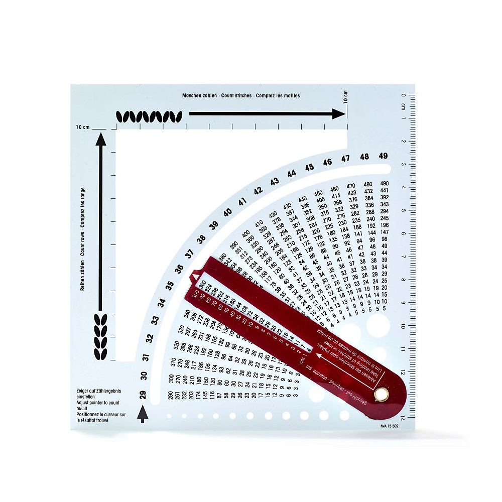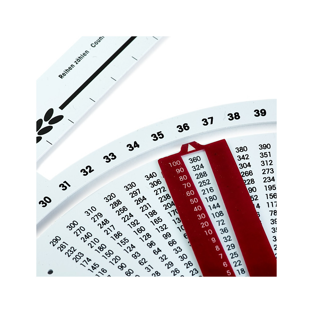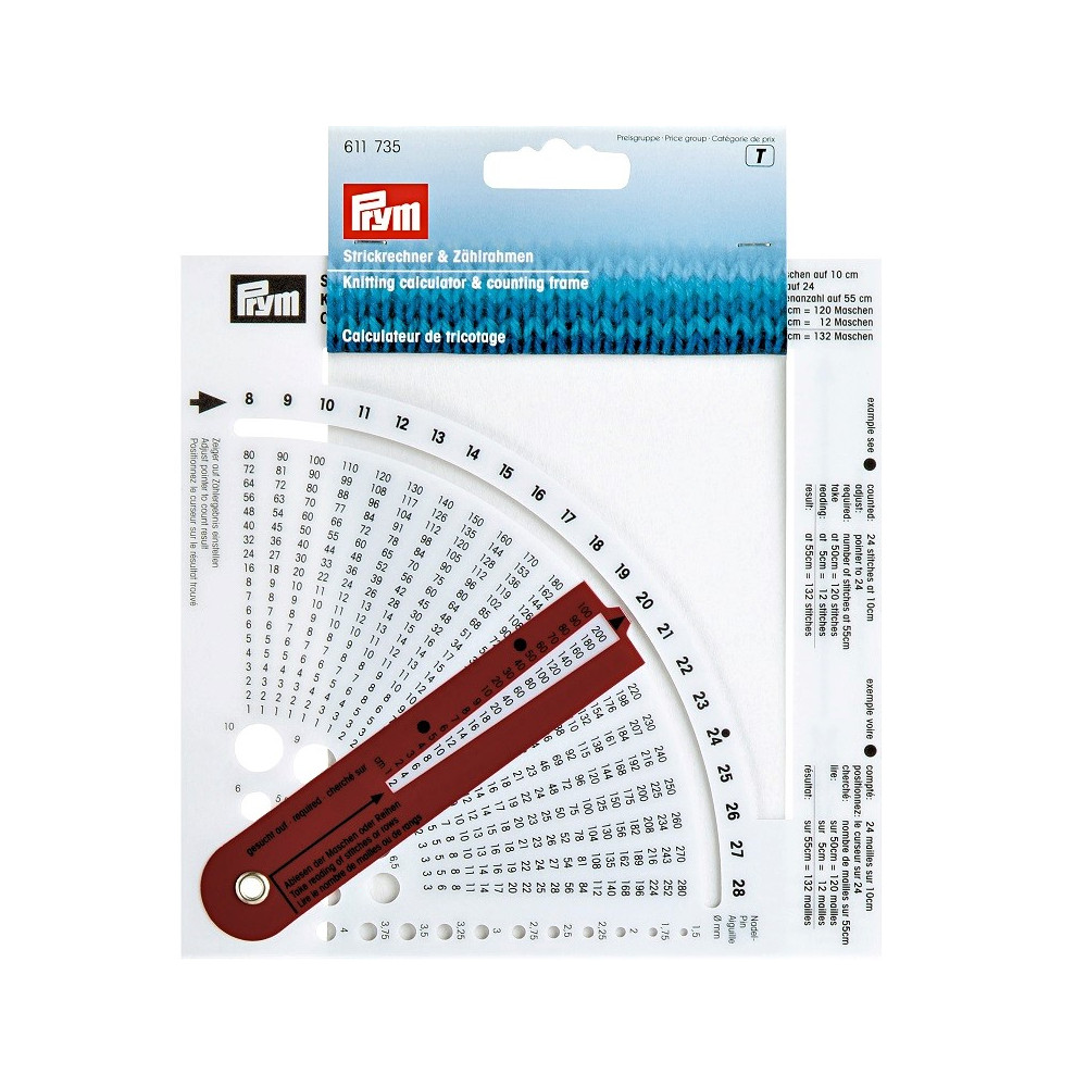Perfektní pomůcka při pletení svetrů a jiných oděvů. Obsahuje také měřidlo pro určení velikosti jehlic (od 1,5 mm do 10 mm) Počítá oka a řádky a převádí potřebné množství ok a řádků na požadovanou velikost oděvu se započtením tloušťky příze. Nejprve se pomocí počítacího rámečku vypočítá množství ok a řádků na 10 cm. Poté se posuvník nastaví na vypočítanou hodnotu na stupnici od 8 do 49 ok na 10 cm. V okénku se přímo zobrazuje počet ok a řádků pro délky 1 cm až 100 cm.