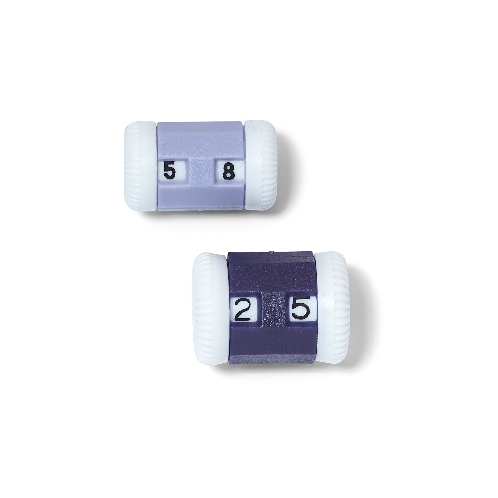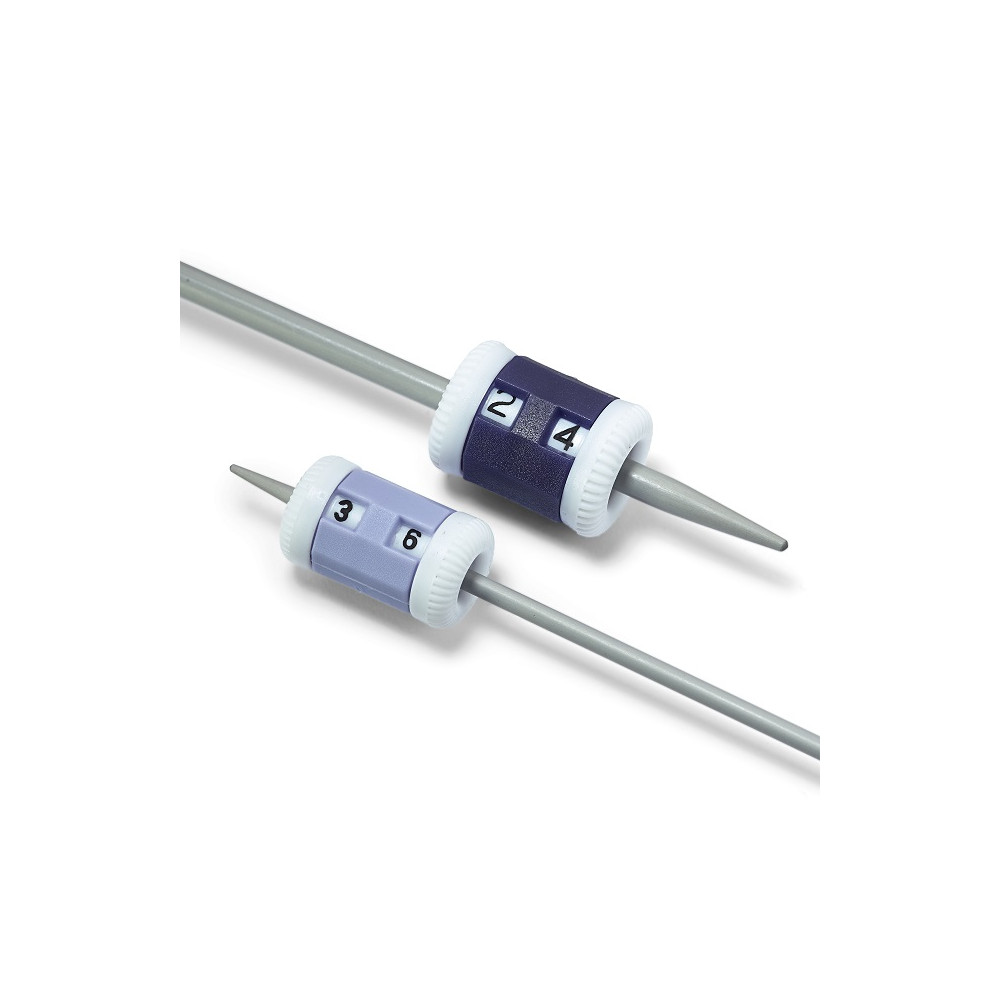 Počítadla (jedno pro silnější a druhé pro tenčí) pletací jehlice. Snadno se dají nasadit na jehlice. Pletené řádky lze spočítat na dvouciferném displeji přímo na pletací jehlici. To je obzvláště užitečné ve chvíli, kdy se pletení přeruší. Počítadlo s nakonfigurovaným množství řádků je spolehlivě připevněno na jehlici k pletenině. Při návratu k pletení, nemusíte znovu složitě přepočítávat řádky.