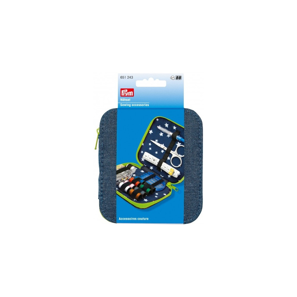 Pouzdro (cca 11 x 12 x 3 cm) obsahuje: 1 metr, 1 páráček s krytem, 1 nůžky, 8 špulek s nitěmi v různých barvách, 6 knoflíků, 3 našívací patentky, 1 navlékač, 1 náprstek, 25 ručních jehel, 20 špendlíků, 6 spínacích špendlíků