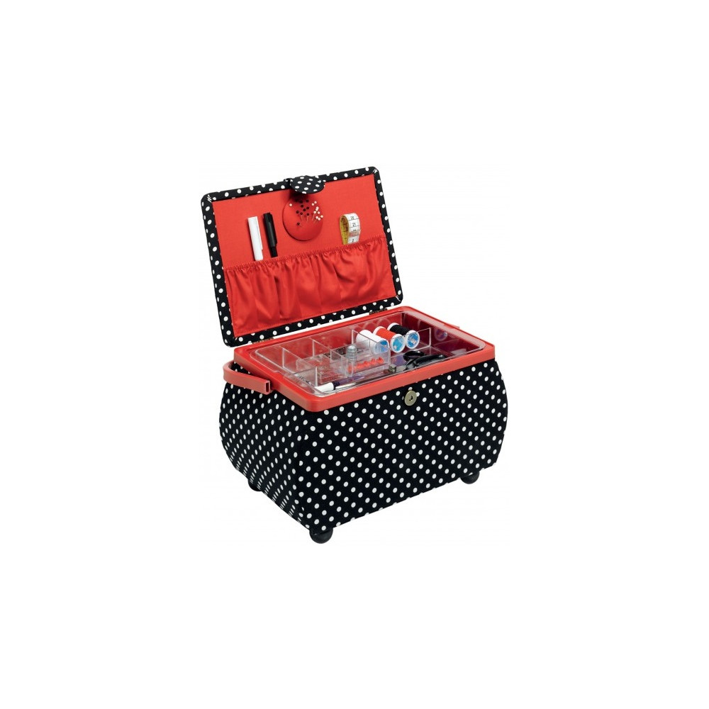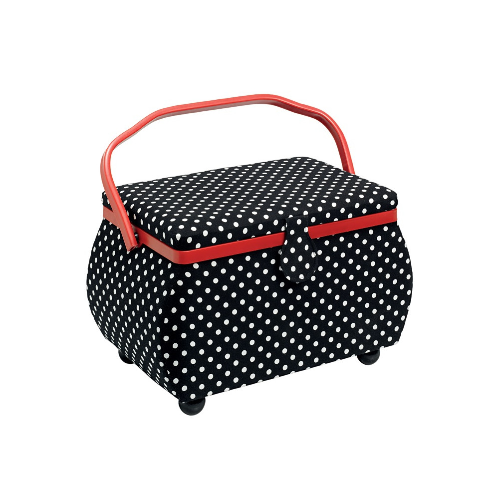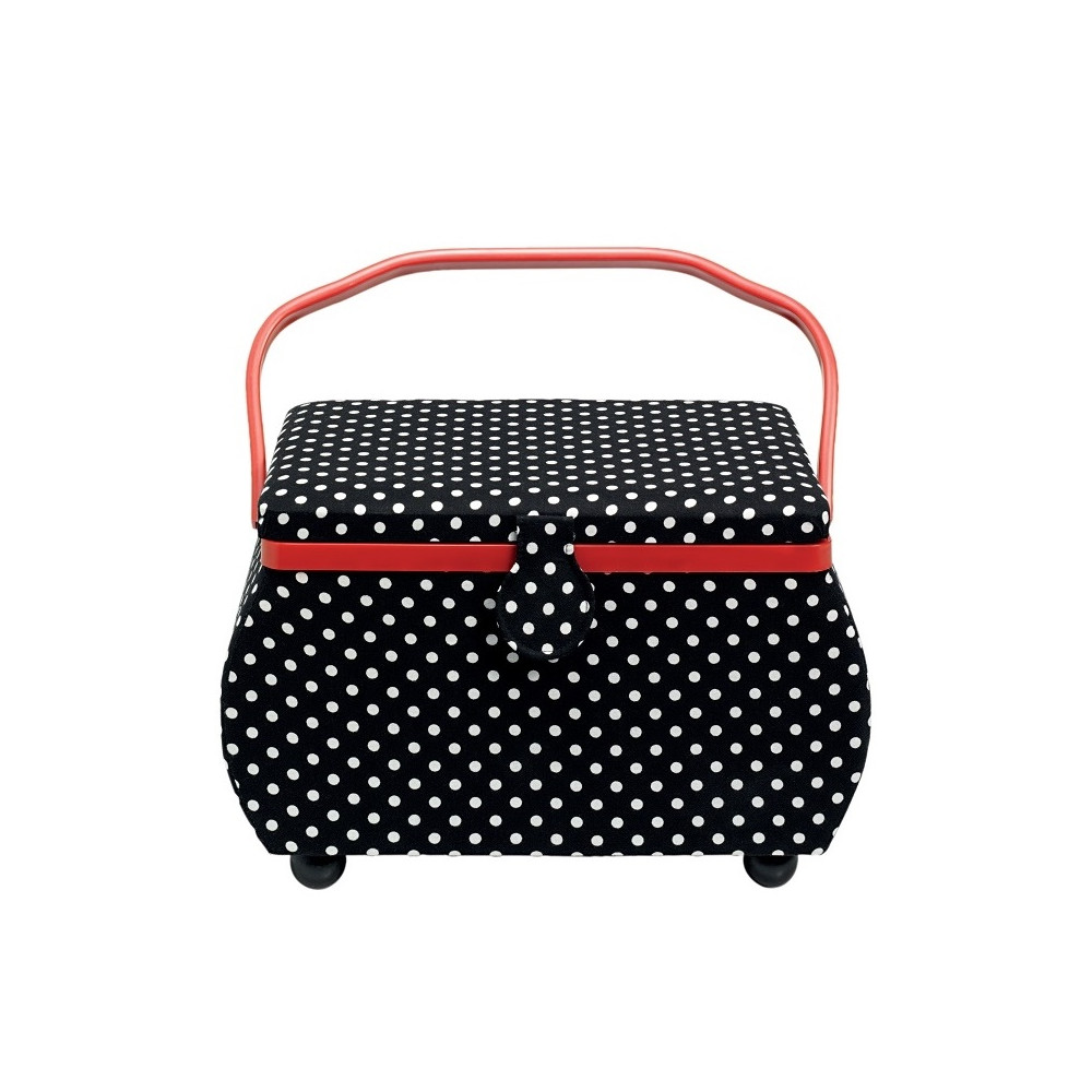 Stylová čalouněná kazeta na šicí potřeby s atraktivním puntíkovaným vzorem.