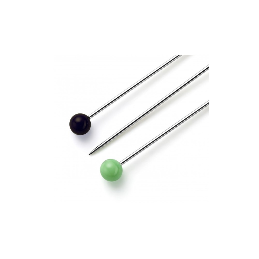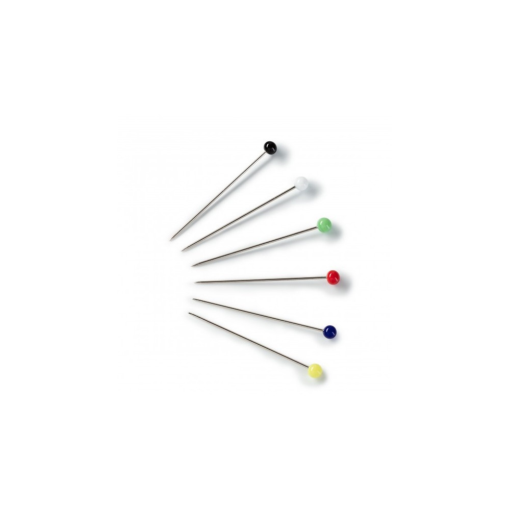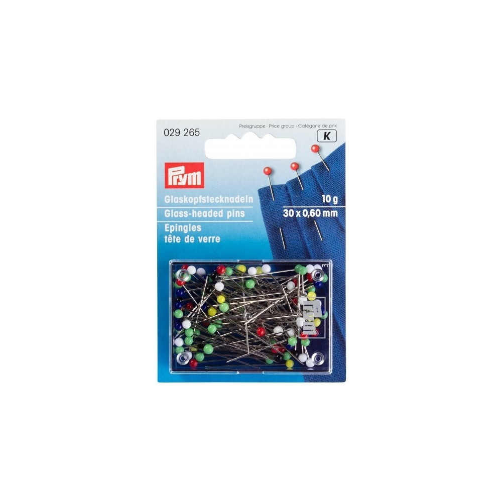 Odolné špendlíky se skleněnou hlavičkou v různých barvách v plastové dóze