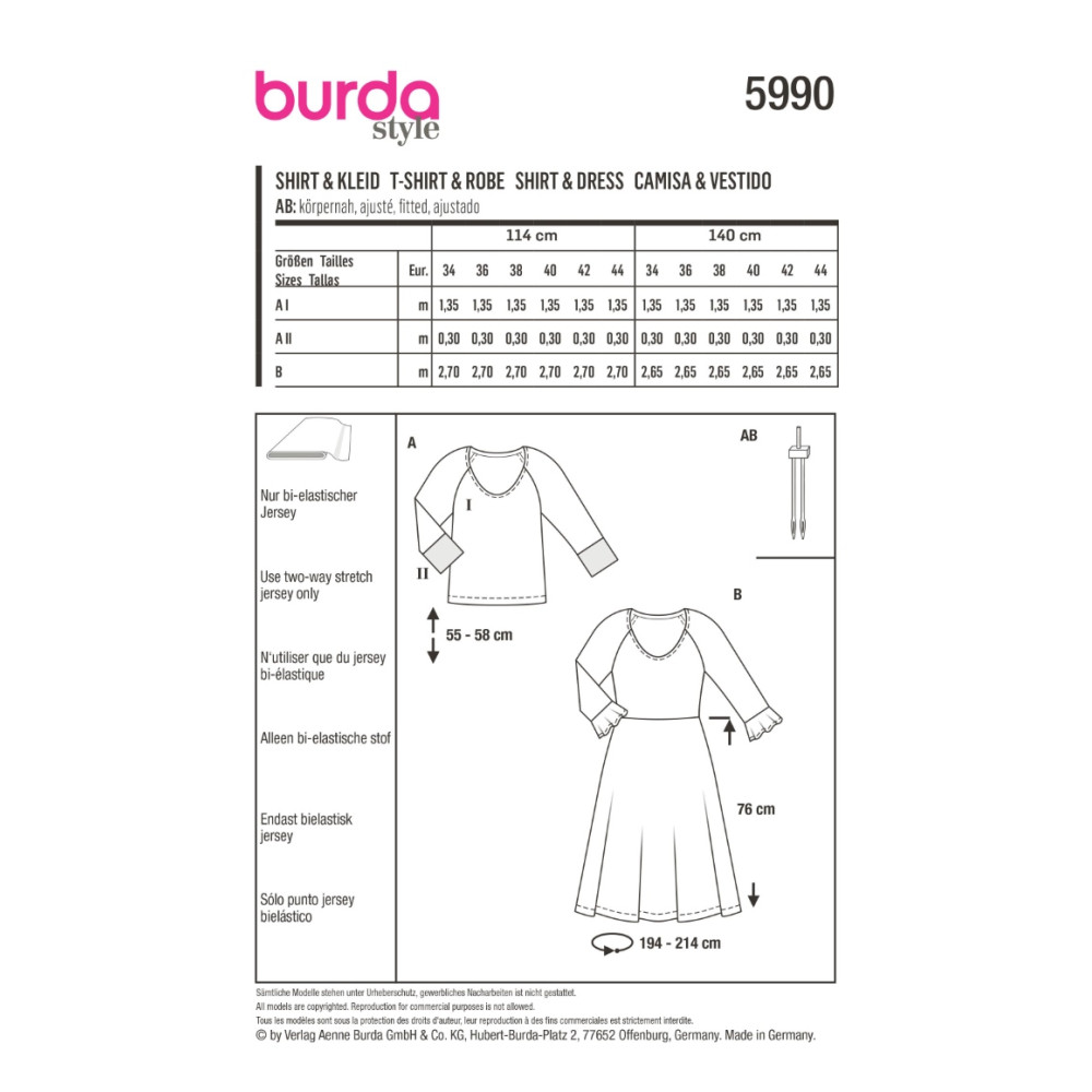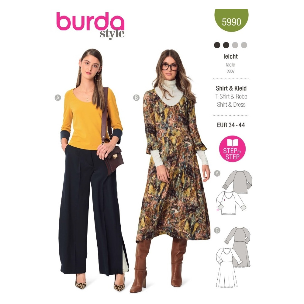 Střih Burda 5990, návod k šití: tričko, tričkové šaty, žerzejové šaty