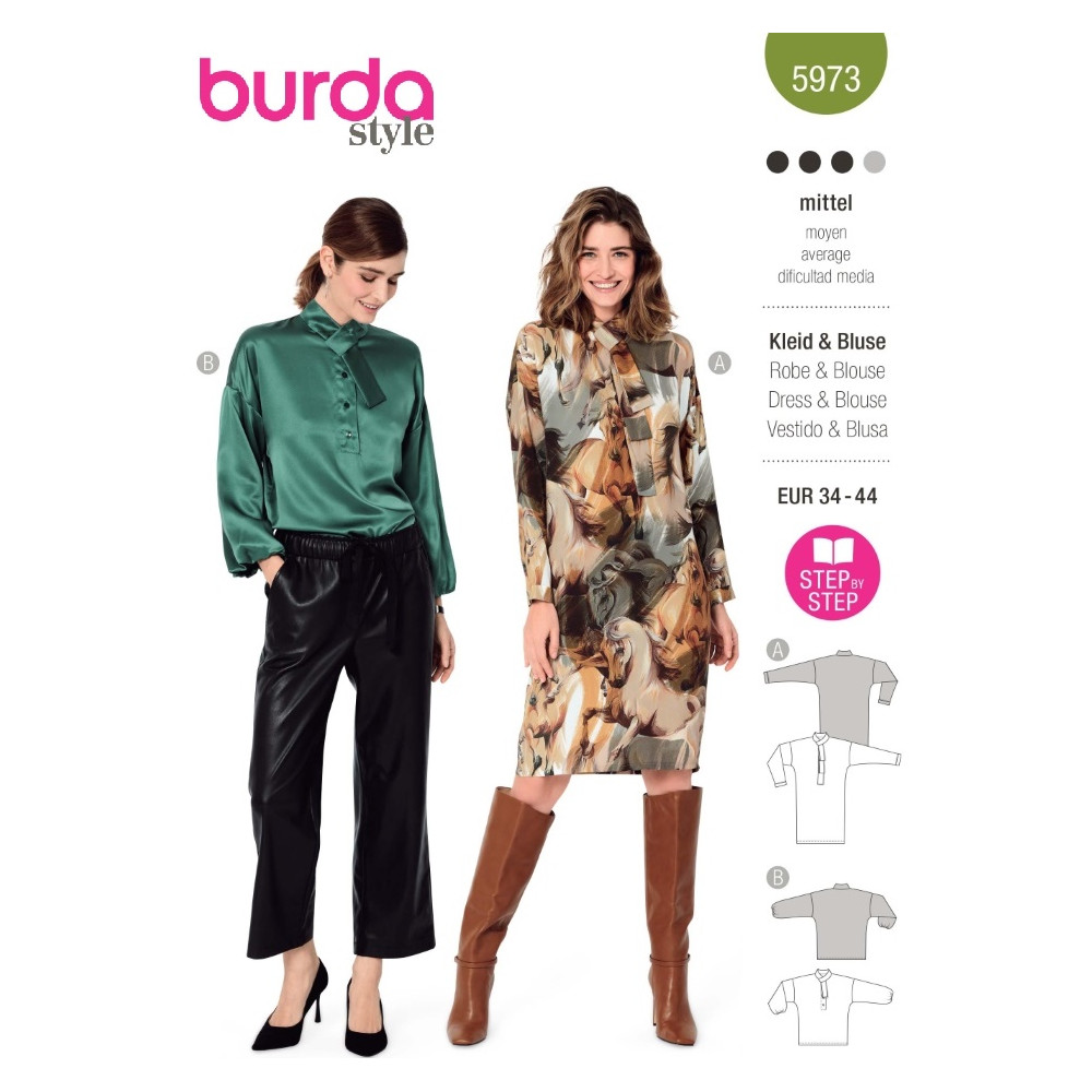 Střih Burda 5973, návod k šití: halenkové šaty se šálovým límcem, halenka