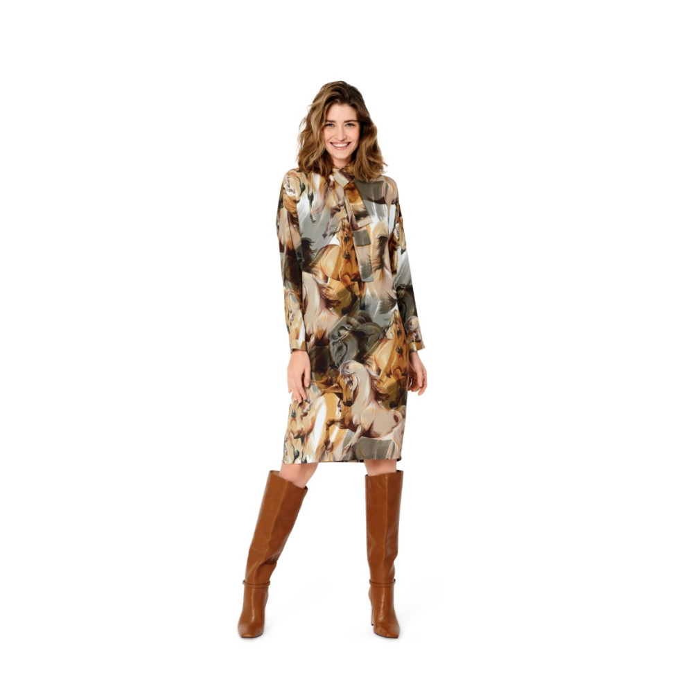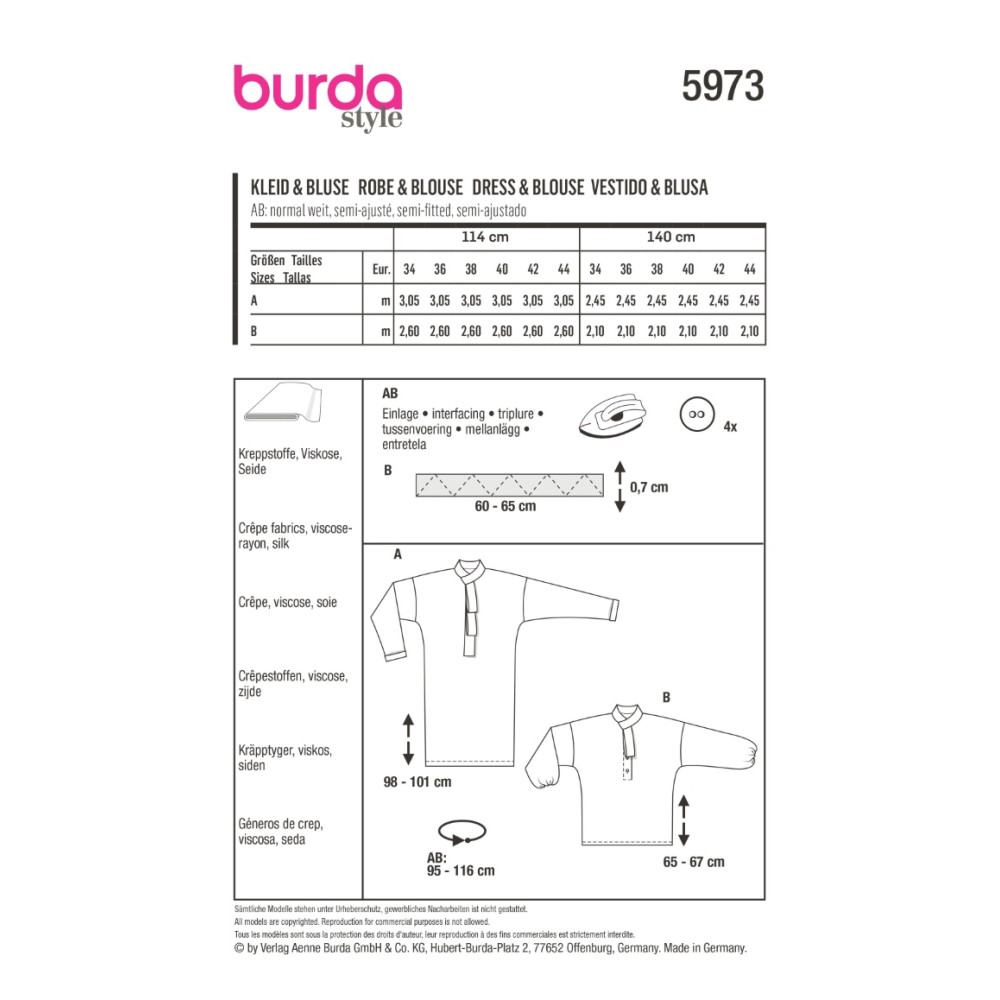 Střih ve velikostech EUR 34-44, úroveň obtížnosti šití: 3 střední info, doporučené látky: krepové látky, viskóza, hedvábí
