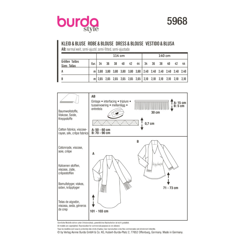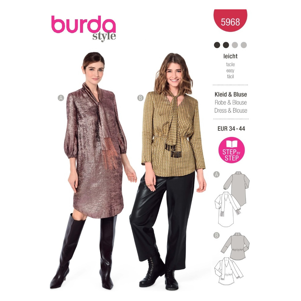 Střih Burda 5968, návod k šití: šaty se šálovým límcem, halenka
