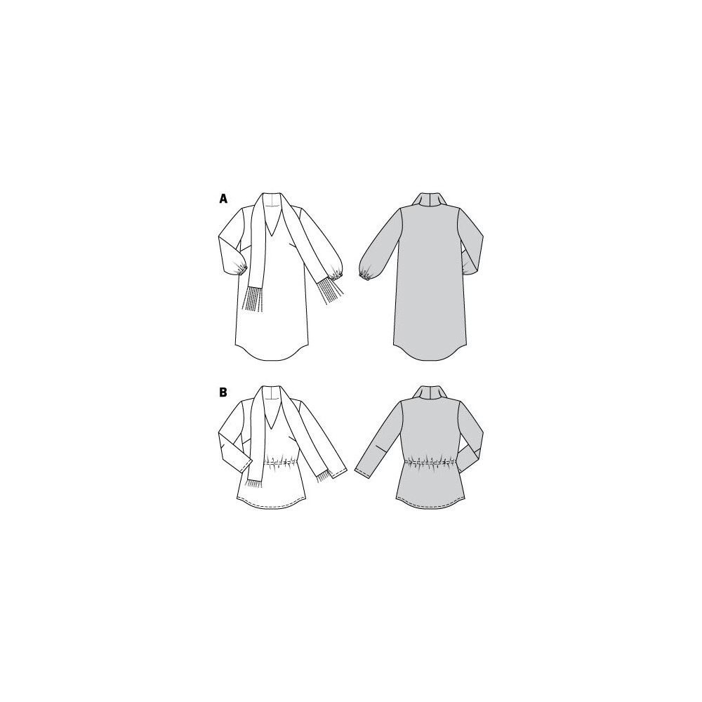 Střih ve velikostech EUR 34-44, úroveň obtížnosti šití: 2 lehká info, doporučené látky: bavlna, viskóza, hedvábí, krepové látky