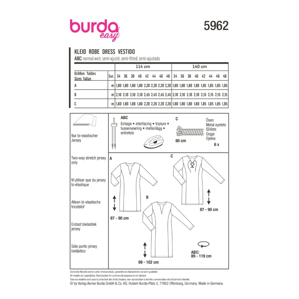 Střih Burda 5962, návod k šití: úzké šaty, tričkové šaty, tunika