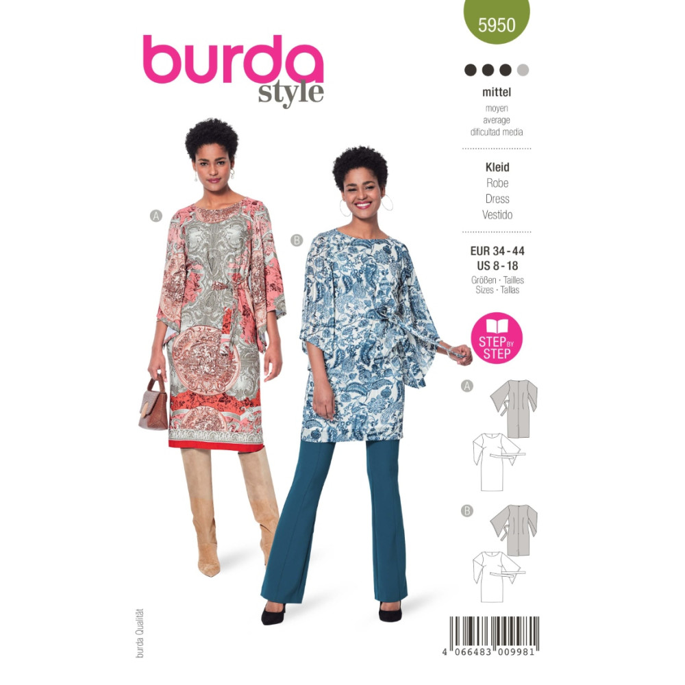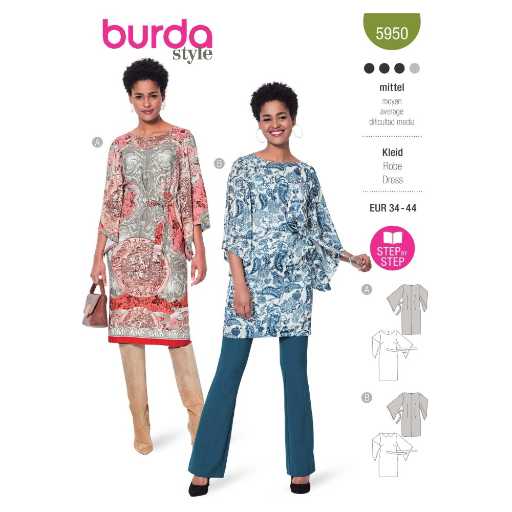 Střih Burda 5950, návod k šití: halenkové šaty s páskem, tunika, tričkové šaty