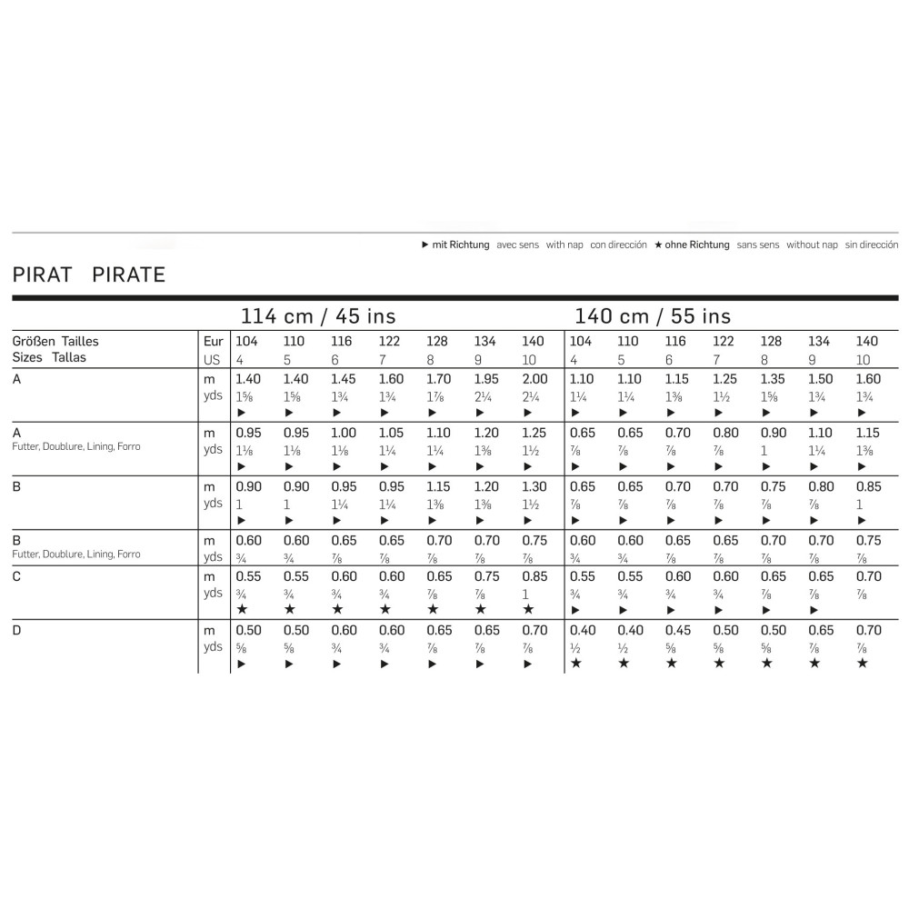 Doporučené látky a tabulka se spotřebou látek pro více velikostí a různé šíře látek (114 cm a 140 cm)
