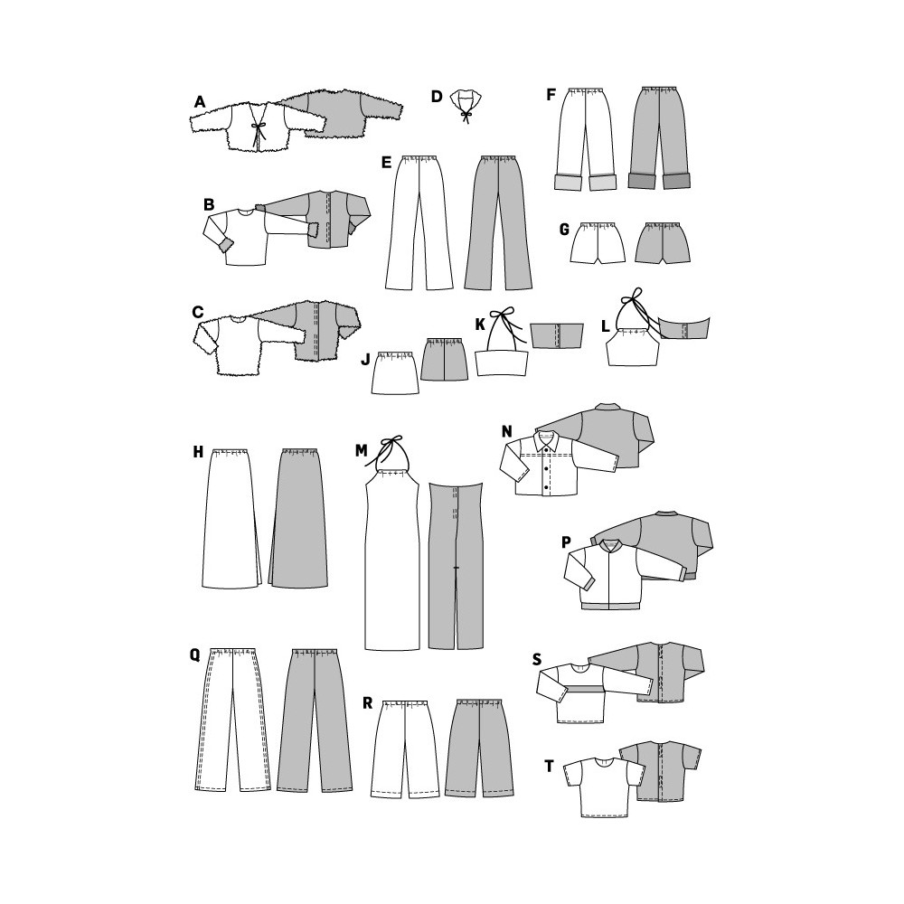 Ve střihové příloze naleznete také: polohový plán střihových dílů, doporučení pro přidávání švů a záložek, důležité značky a symboly, které usnadňují šití (např. směr vlákna, čísla švů, ...), tabulku velikostí a měr.
