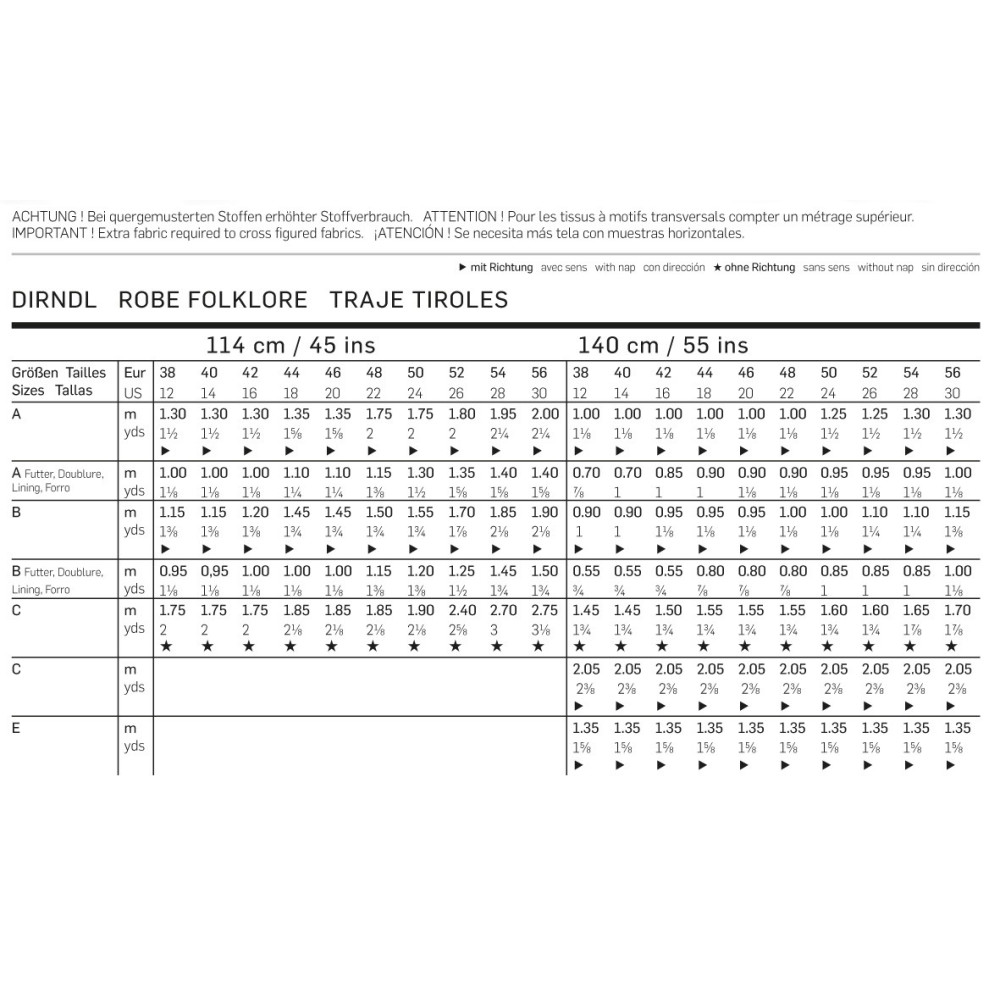 Střih ve velikostech EUR 38-56, úroveň obtížnosti šití: 3 (střední), doporučené látky: bavlna, hedvábný taft, len
