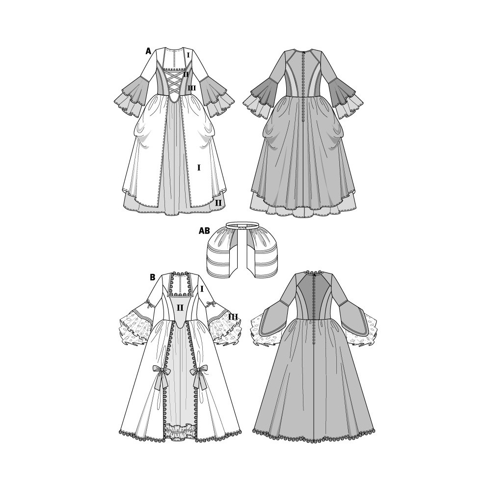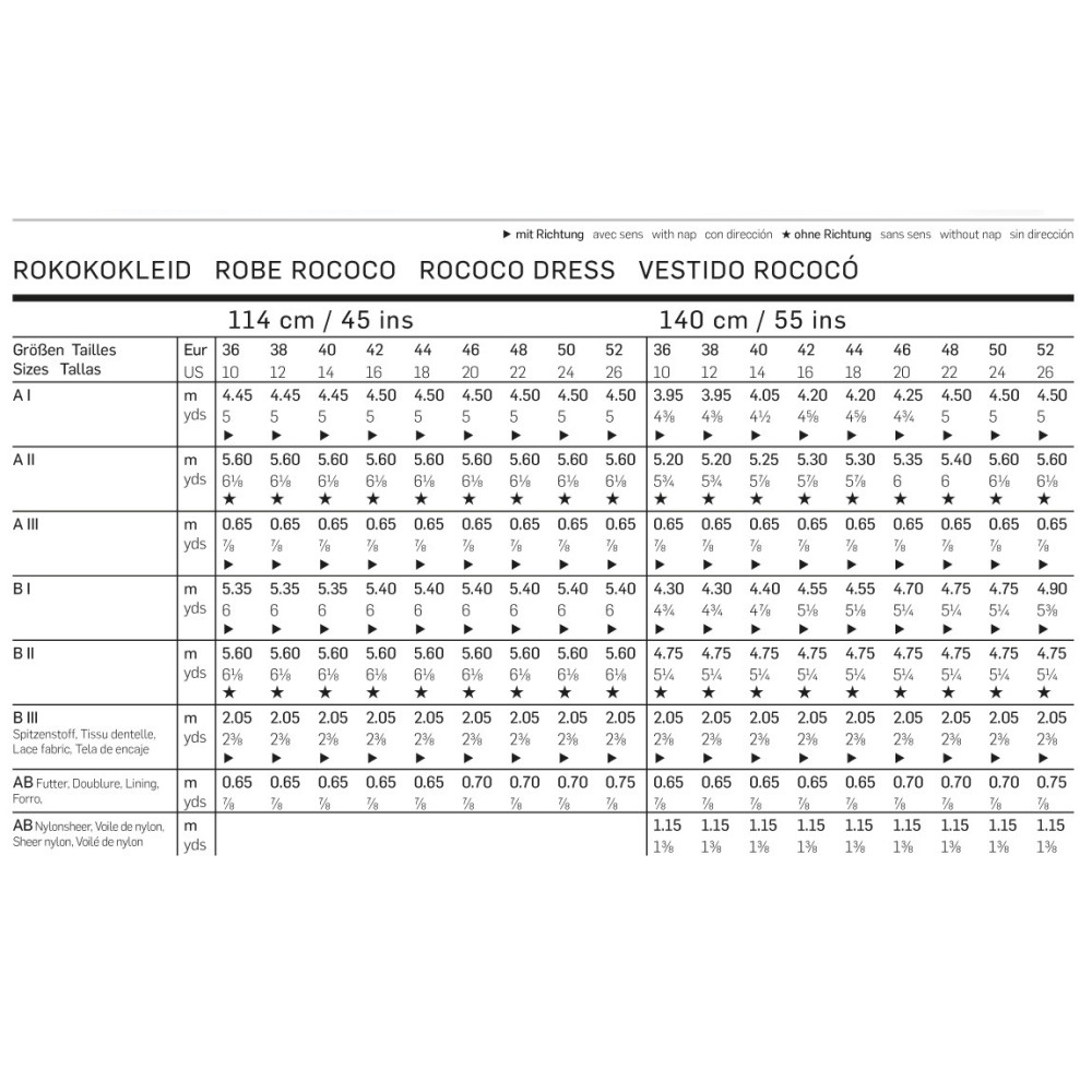 Střih ve velikostech EUR 36-52, úroveň obtížnosti šití: 4 (obtížnější), doporučené látky: samet, satén, brokát