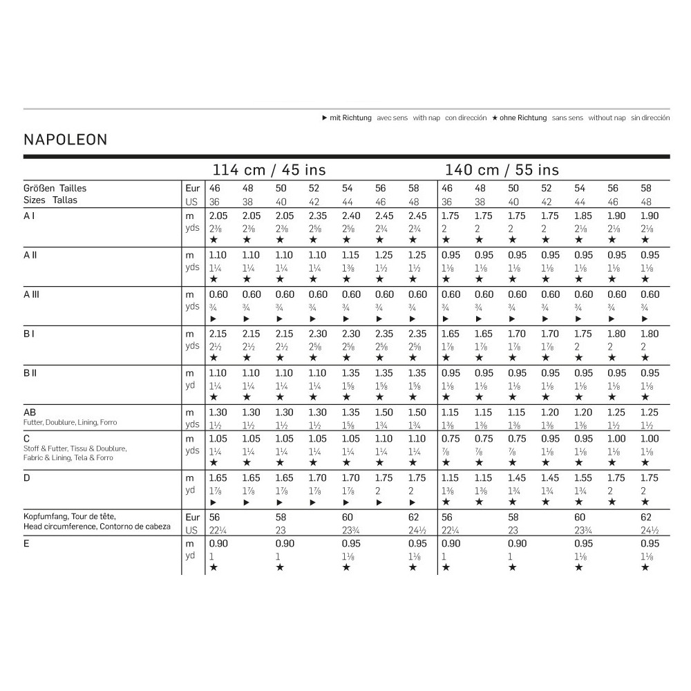 Střih ve velikostech EUR 46-58, úroveň obtížnosti šití: 3 (střední), doporučené látky: vlněné látky, gabardén, strečové látky