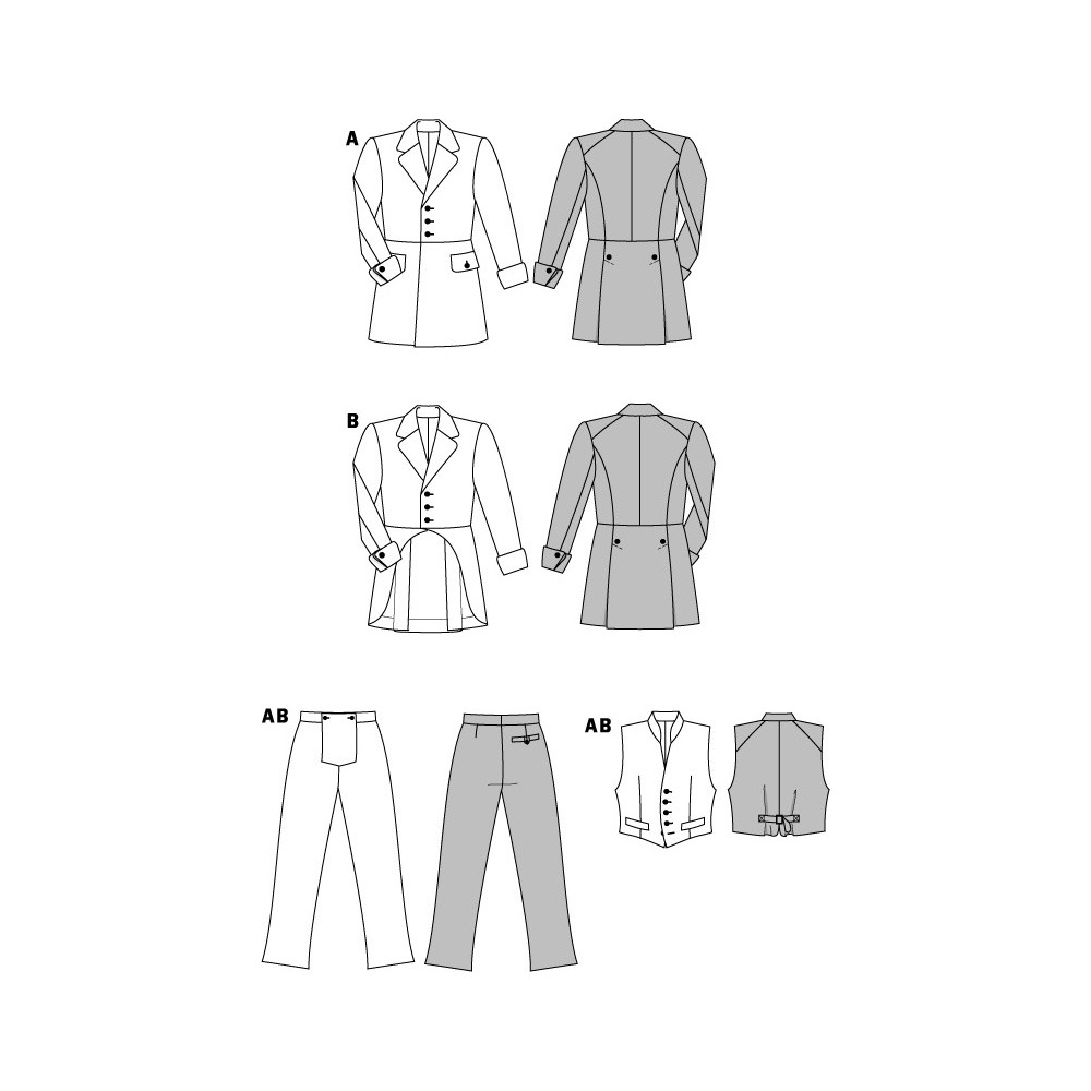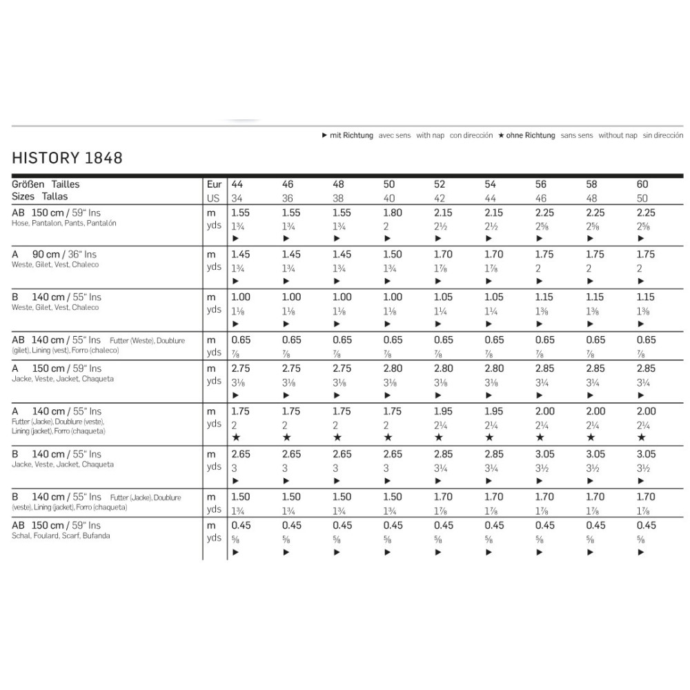 Střih ve velikostech EUR 44-60, úroveň obtížnosti šití: 4 (obtížnější), doporučené látky: samet, flanel, lehčí vlněné látky, žakár