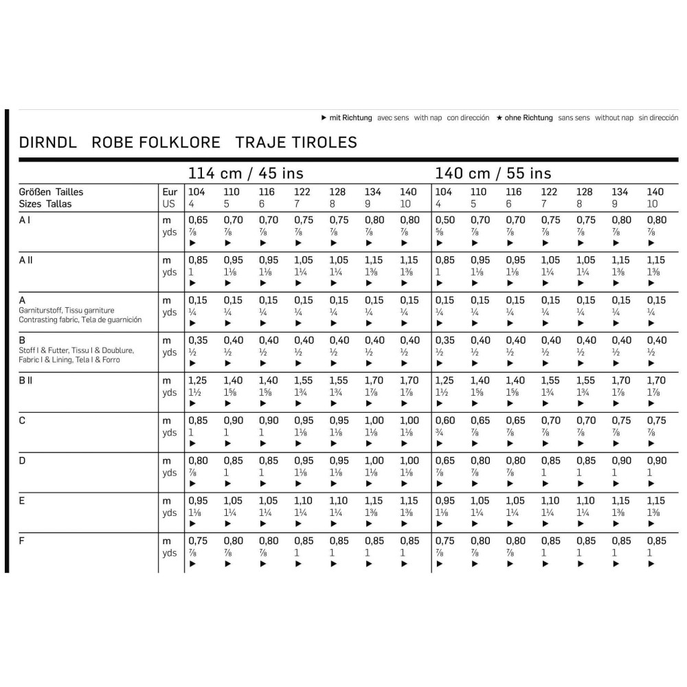 Střih ve velikostech EUR 104-140, úroveň obtížnosti šití: 3 (střední), doporučené látky: bavlna, len, samet