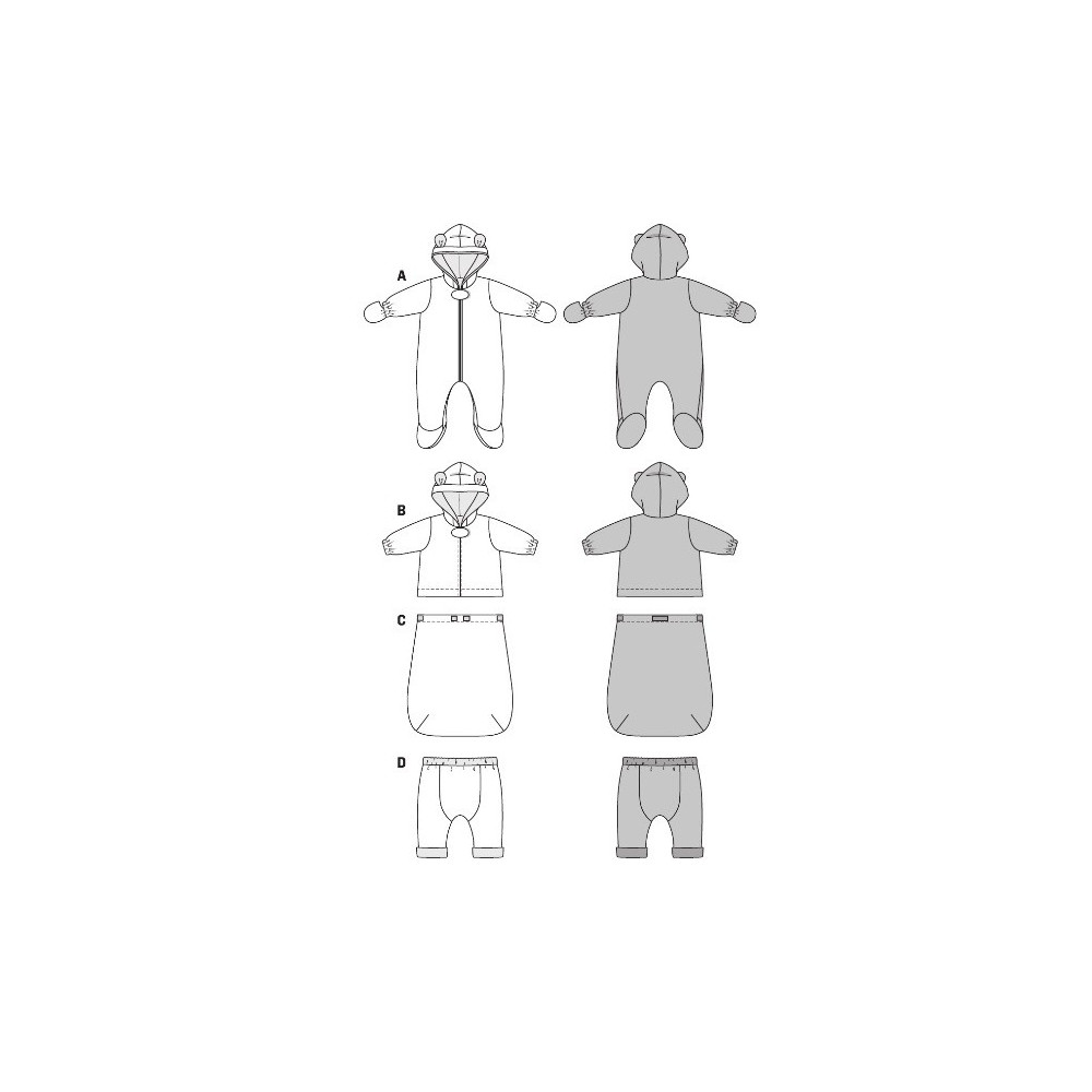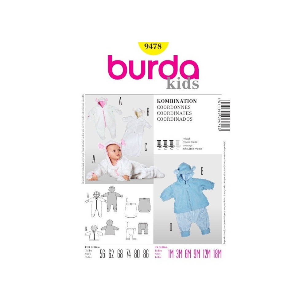Střih ve velikostech EUR 56-86, úroveň obtížnosti šití: 3 (střední), doporučené látky: fleece, dětský manšestr, teplákovina, medvídkovina / plyš