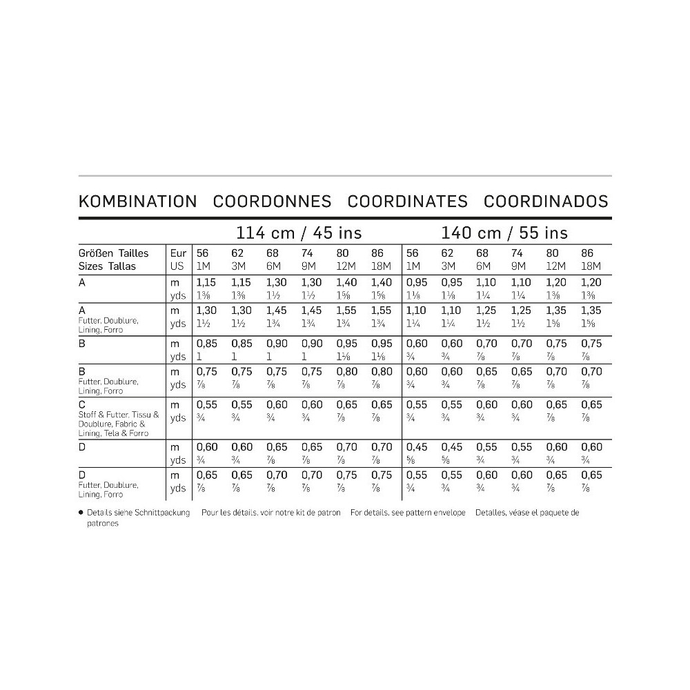 Doporučené látky a tabulka se spotřebou látek pro více velikostí a různé šíře látek (114 cm a 140 cm)