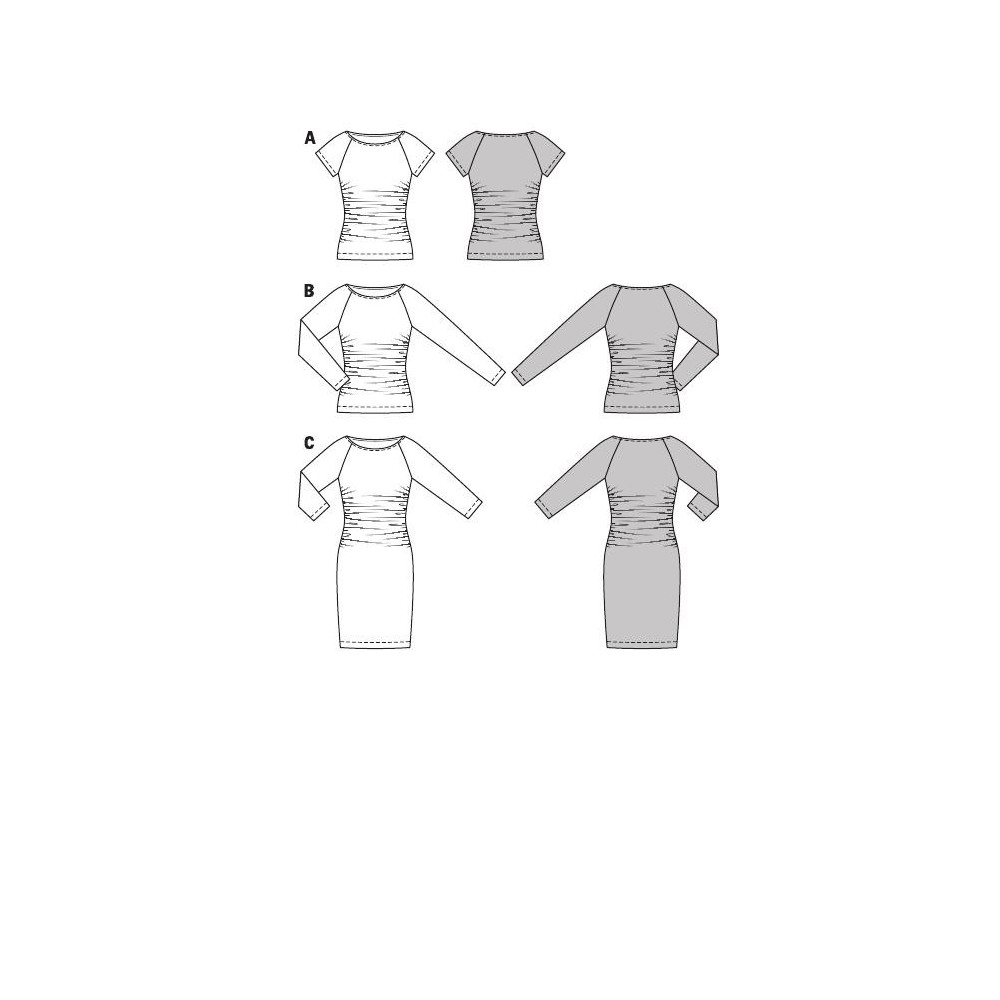 Střih Burda na jednoduché tričko a šaty s lodičkovým výstřihem a s řasením na bocích.