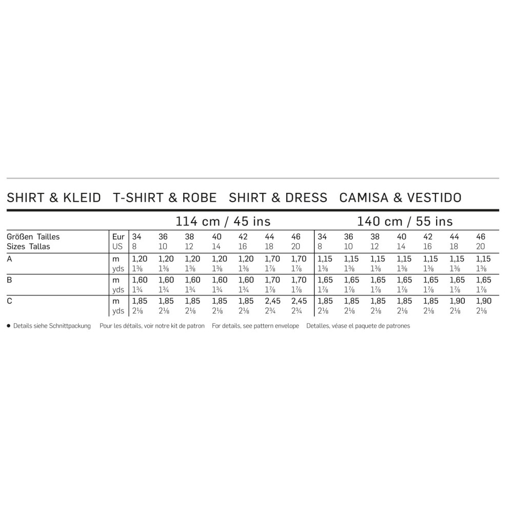 Střih ve velikostech EUR 34-46, úroveň obtížnosti šití: 1 (velmi lehká), doporučené látky: pouze bi-elastický žerzej