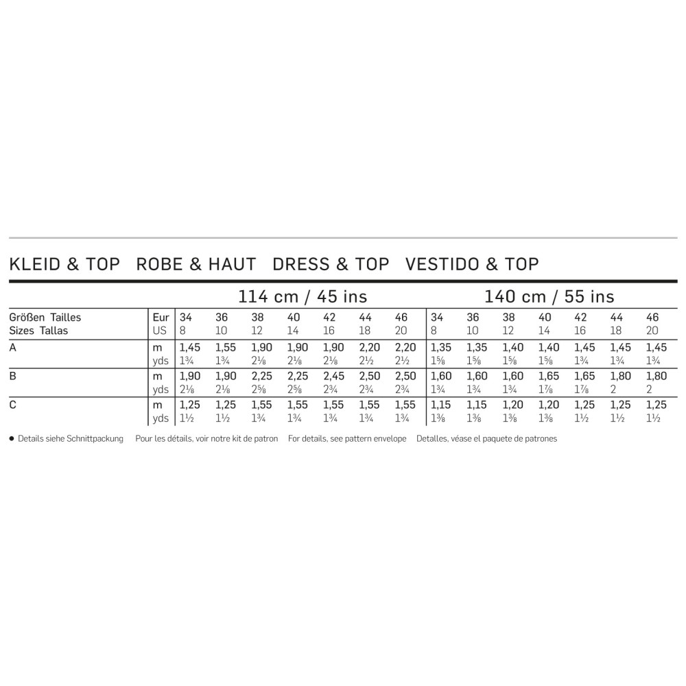 Střih ve velikostech EUR 34-46, úroveň obtížnosti šití: 2 (lehká), doporučené látky: krepové látky, lehčí bavlna, viskóza, krepsatén