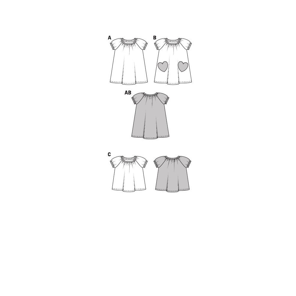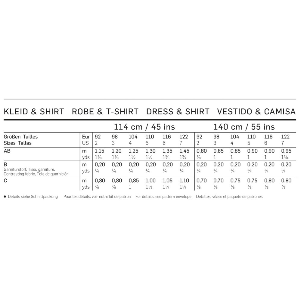 Střih ve velikostech EUR 92-122, úroveň obtížnosti šití: 1 (velmi lehká), doporučené látky: lehčí bavlna, žerzej