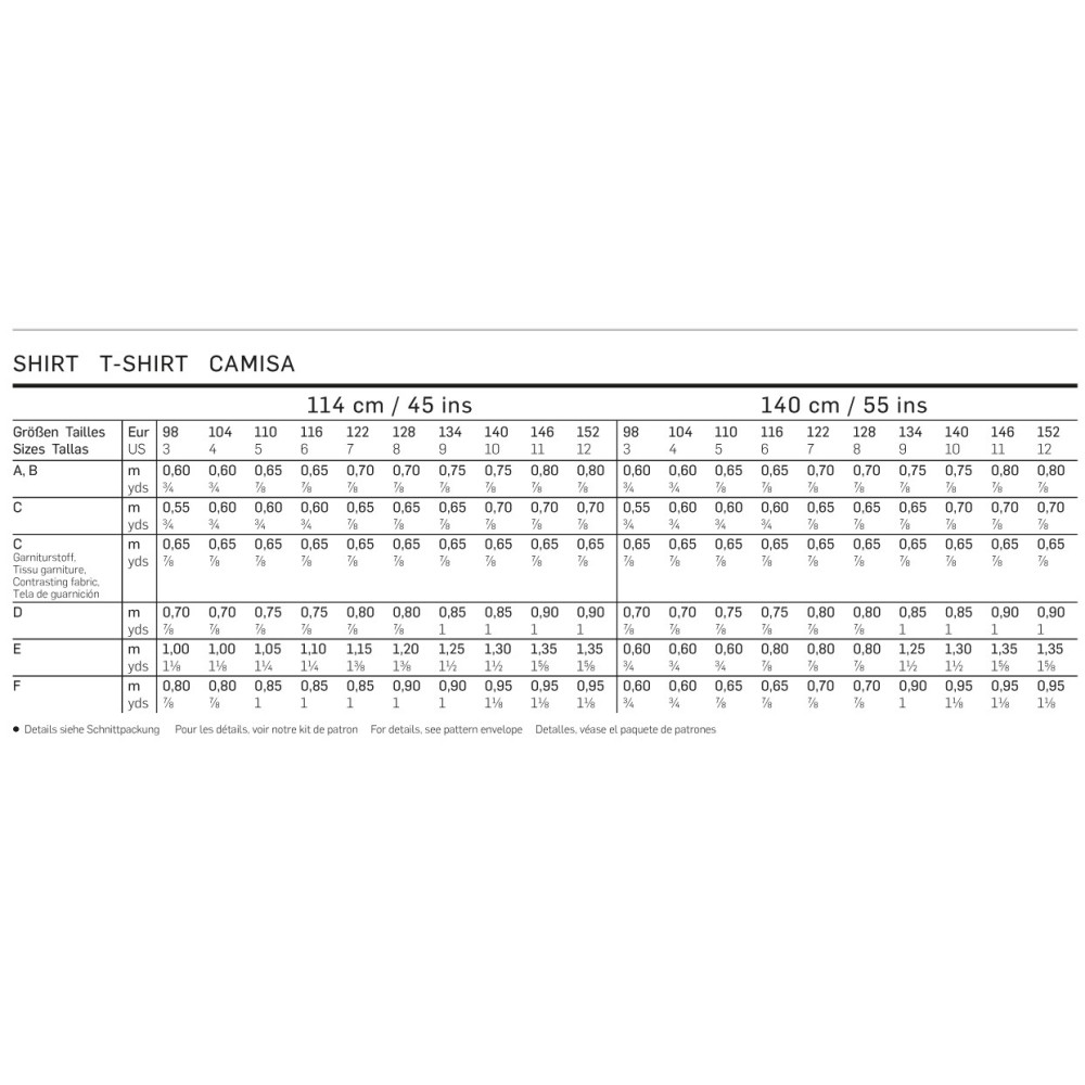 Střih ve velikostech EUR 98-152, úroveň obtížnosti šití: 1 (velmi lehká), doporučené látky: žerzej