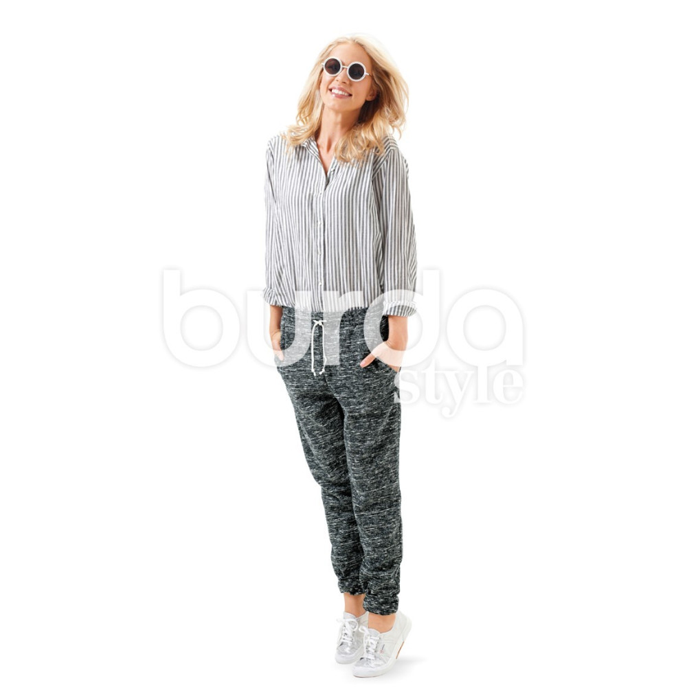 Střih Burda na teplákové kalhoty ve dvou délkách s pasem do gumy a šňůrkou.