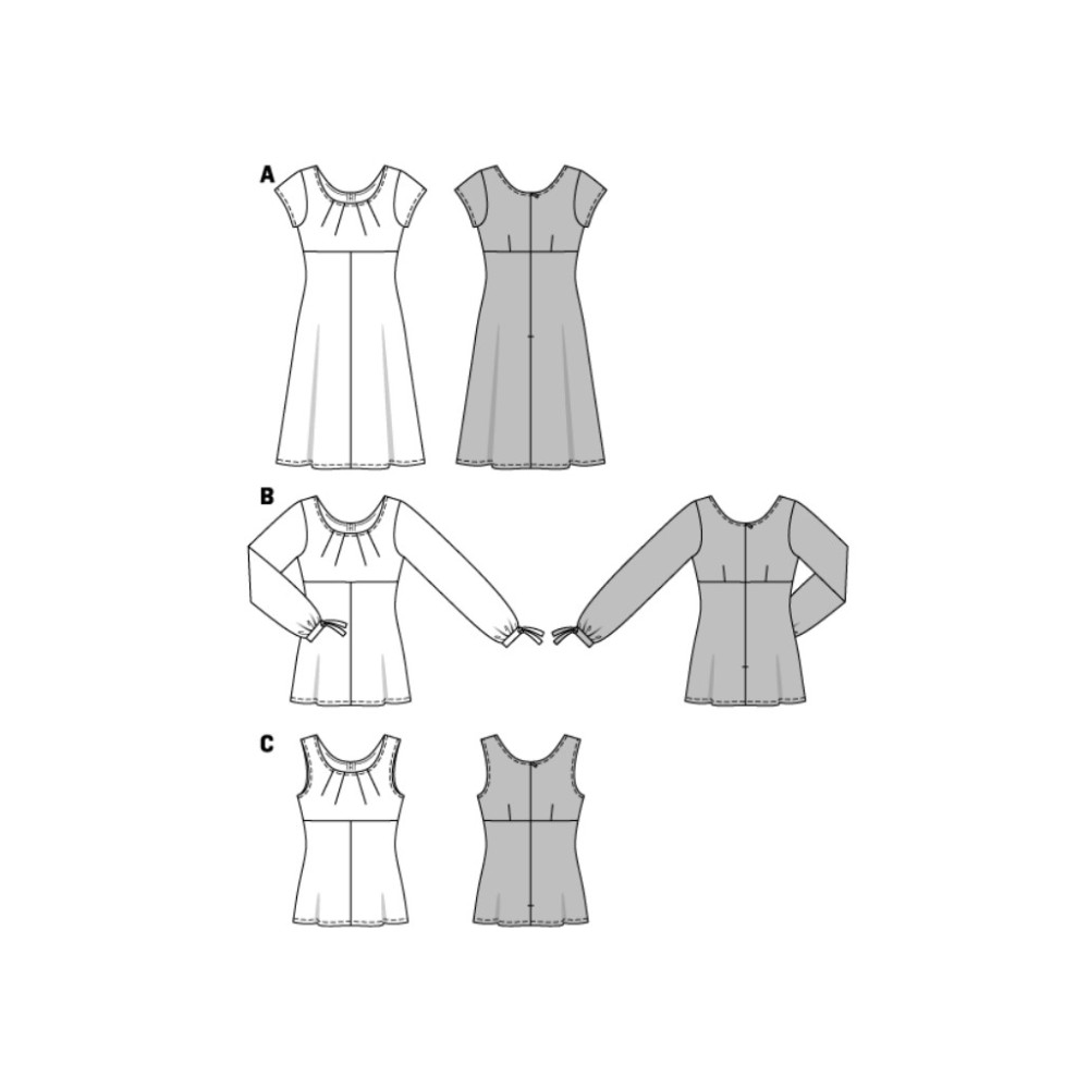 Střih Burda na áčkové šaty a halenku s kulatým výstřihem a vysokým pasem.