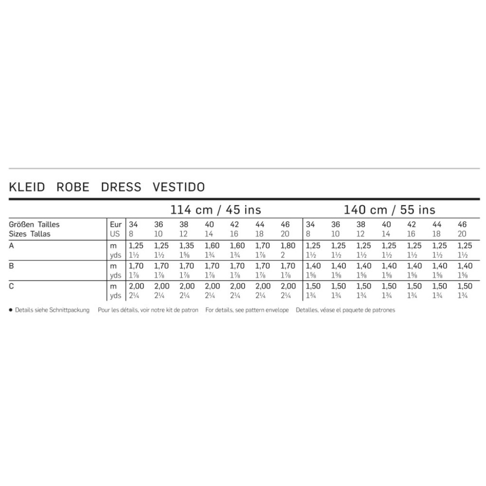 Střih ve velikostech EUR 34-46, úroveň obtížnosti šití: 2 (lehká), doporučené látky: bavlna, viskóza, krepové látky
