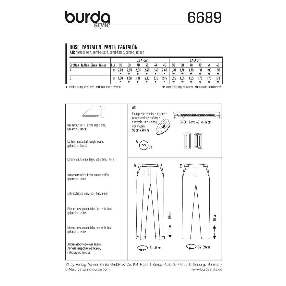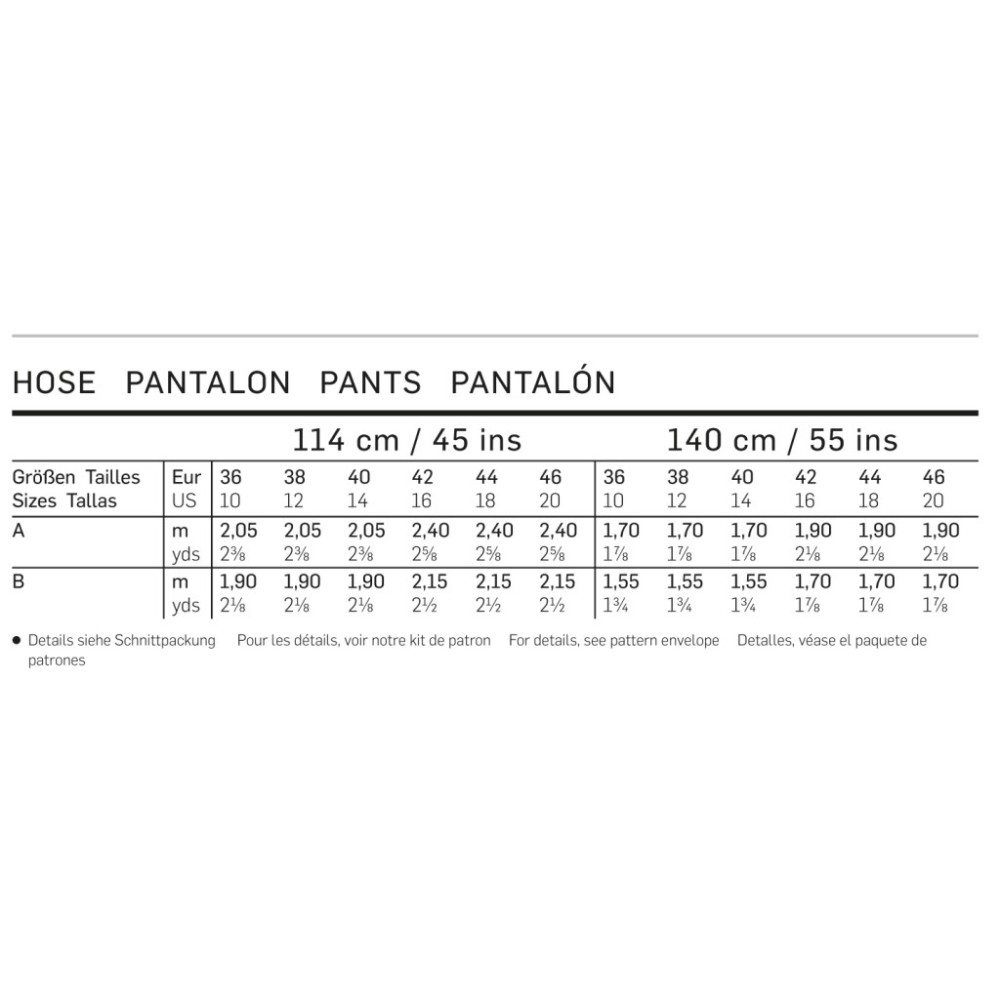 Střih ve velikostech EUR 36-46, úroveň obtížnosti šití: 3 (střední), doporučené látky: bavlna, lehčí vlněné látky, gabardén, tencel