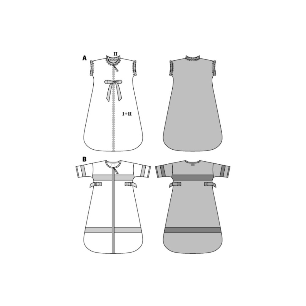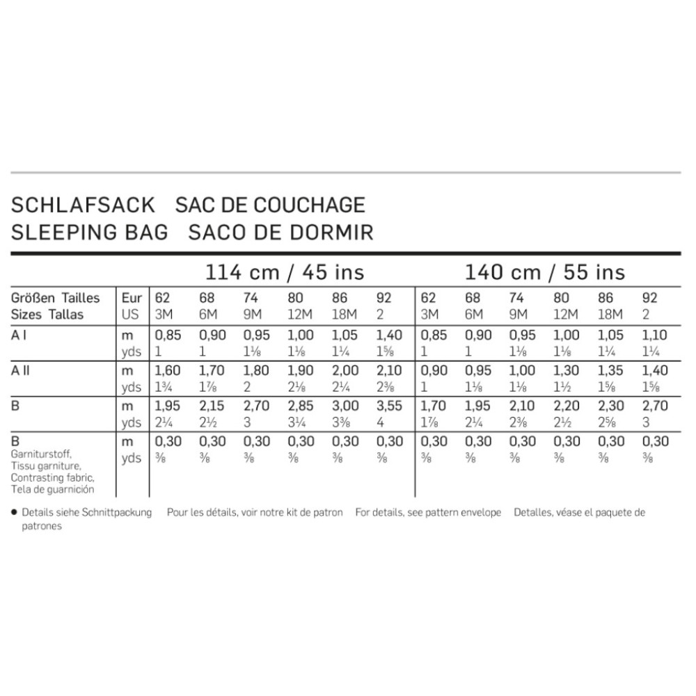 Střih ve velikostech EUR 62-92, úroveň obtížnosti šití: 1 (velmi lehká), doporučené látky: bavlna, lehčí prošev