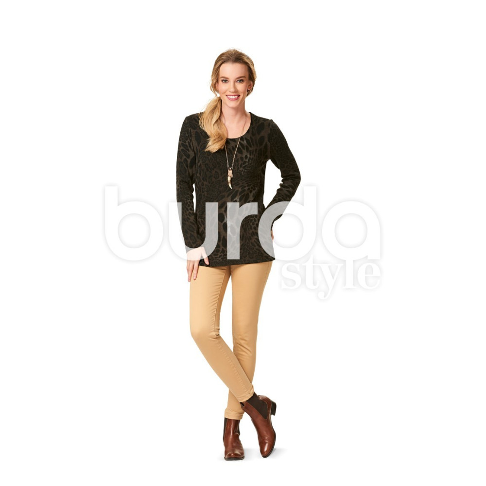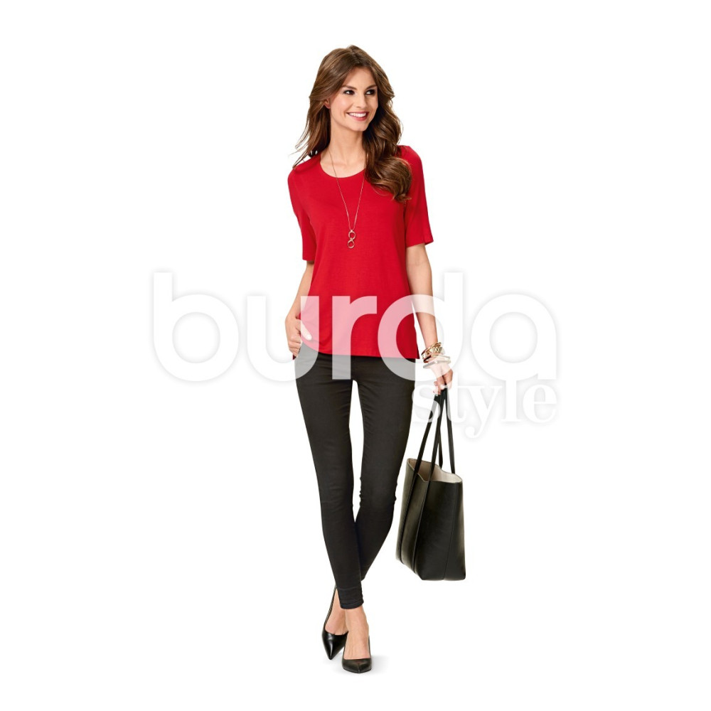 Střih Burda na jednoduché delší tričko s kulatým výstřihem, rukávy a bočními rozparky.