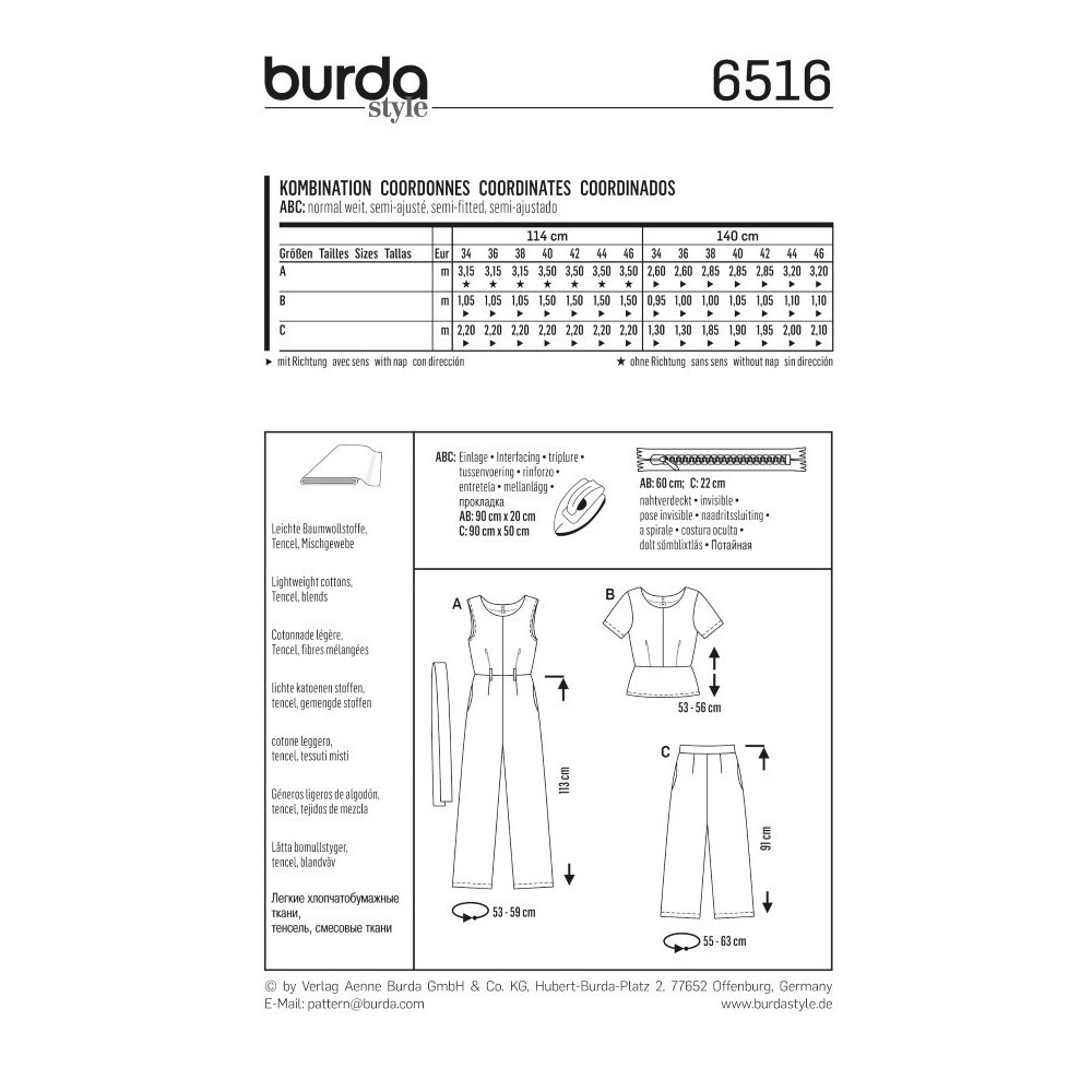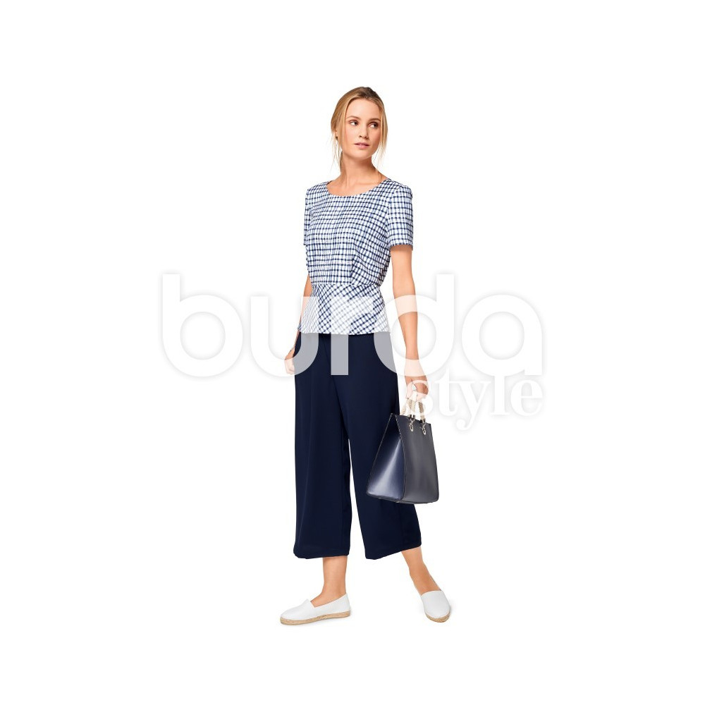 Střih Burda číslo 6516 overal a kalhoty se širokými nohavicemi, top peplum