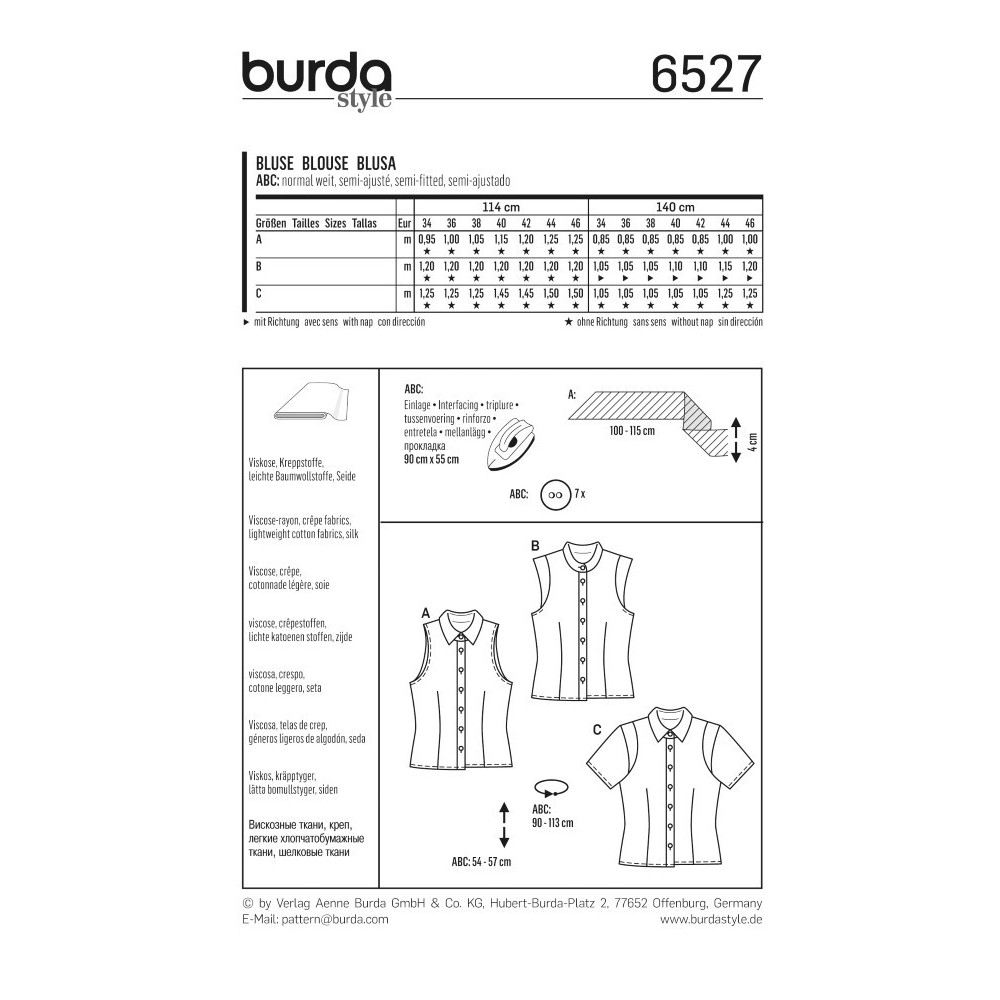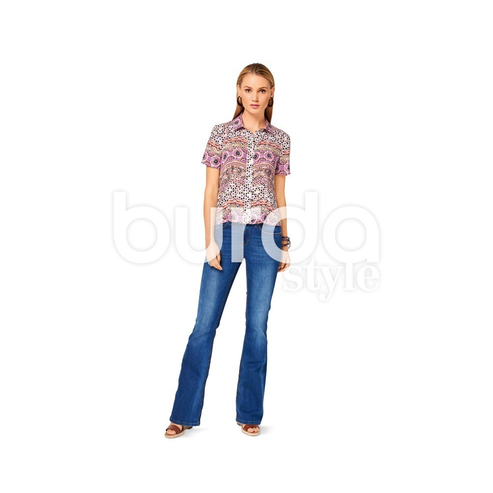 Střih Burda na propínací halenku s límečkem nebo stojáčkem s variantami rukávů.