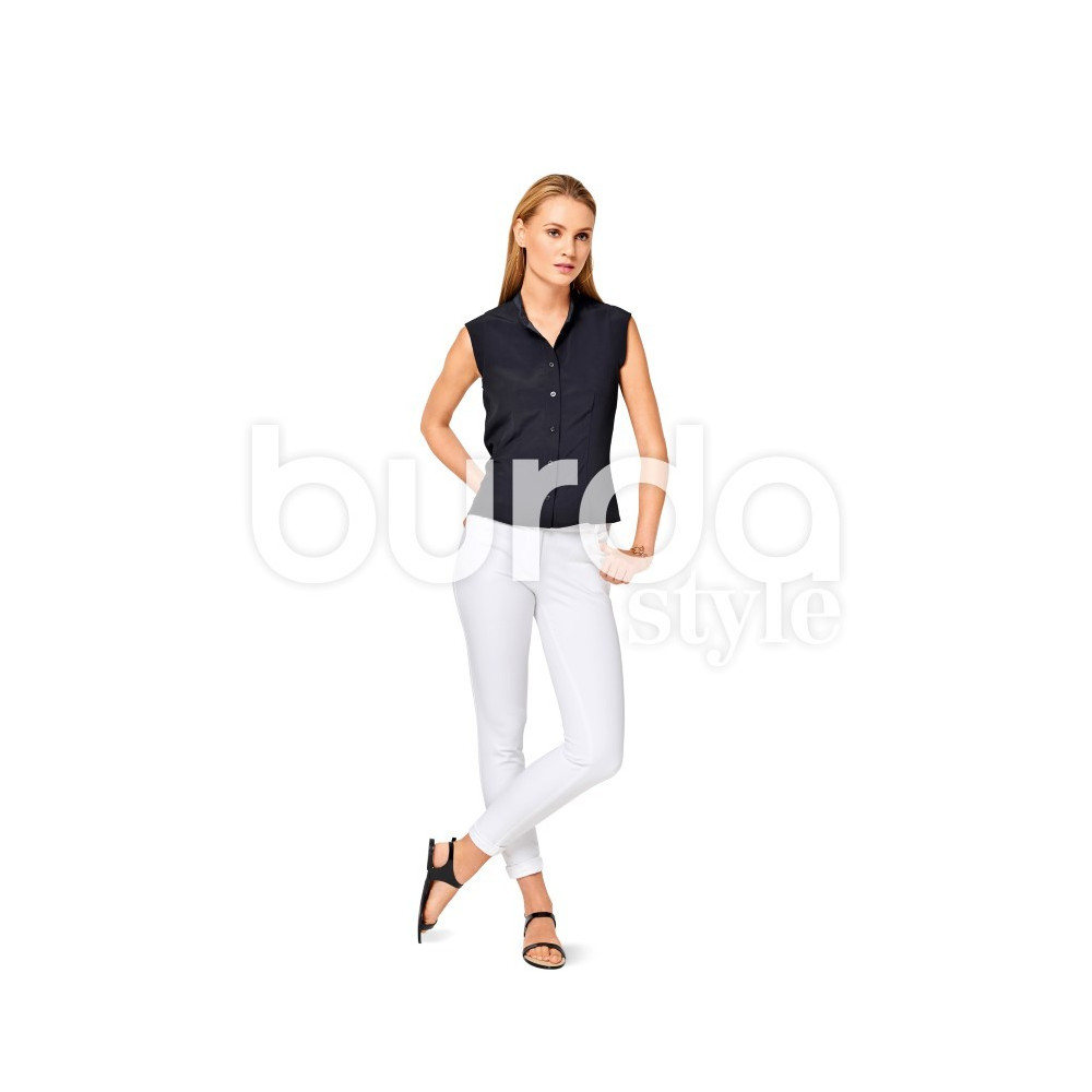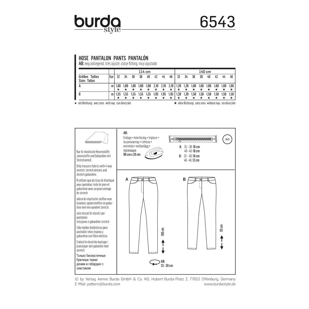 Střih ve velikostech EUR 32-46, úroveň obtížnosti šití: 3 (střední), doporučené látky: pouze bi-elastické kalhotové látky (džínovina a gabardén se strečovým podílem)