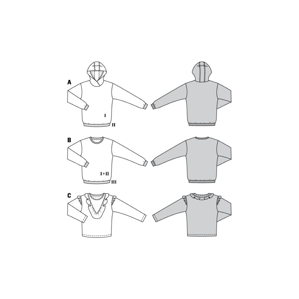 Střih Burda na mikinu s kapucí, mikinu bez kapuce a mikinu s ozdobnými volány.