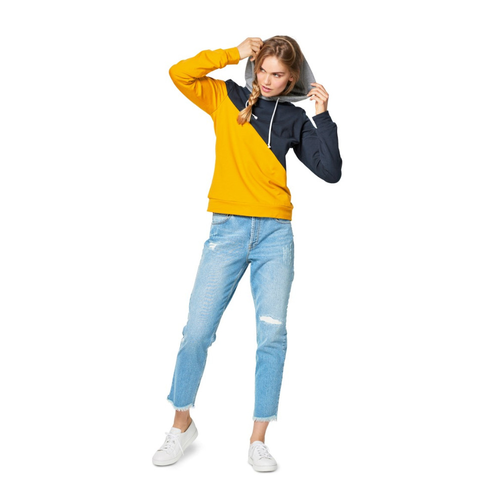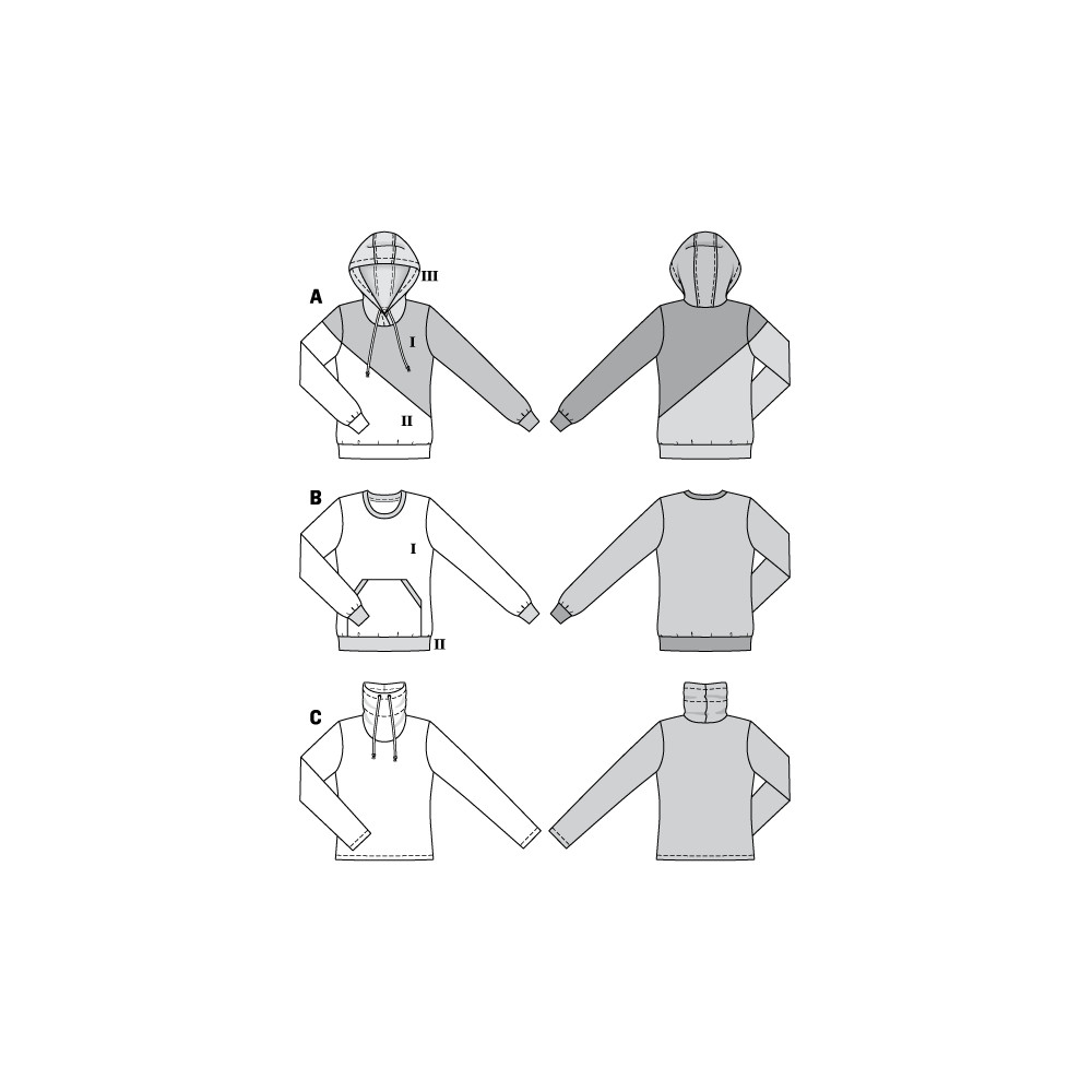 Střih ve velikostech EUR 34-44, úroveň obtížnosti šití: 2 (lehká), doporučené látky: mikinovina / teplákovina, náplet