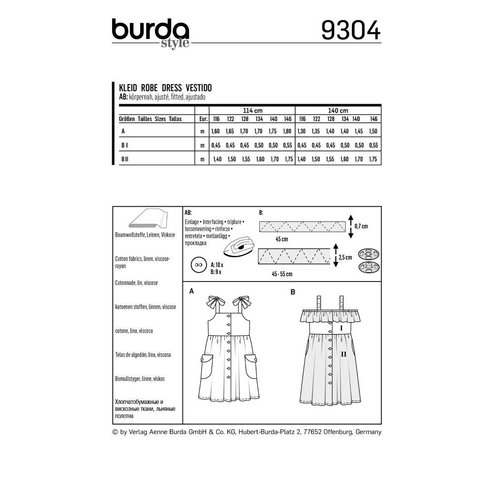 Střih ve velikostech EUR 116-146, úroveň obtížnosti šití: 3 (střední), doporučené látky: bavlna, len, viskóza