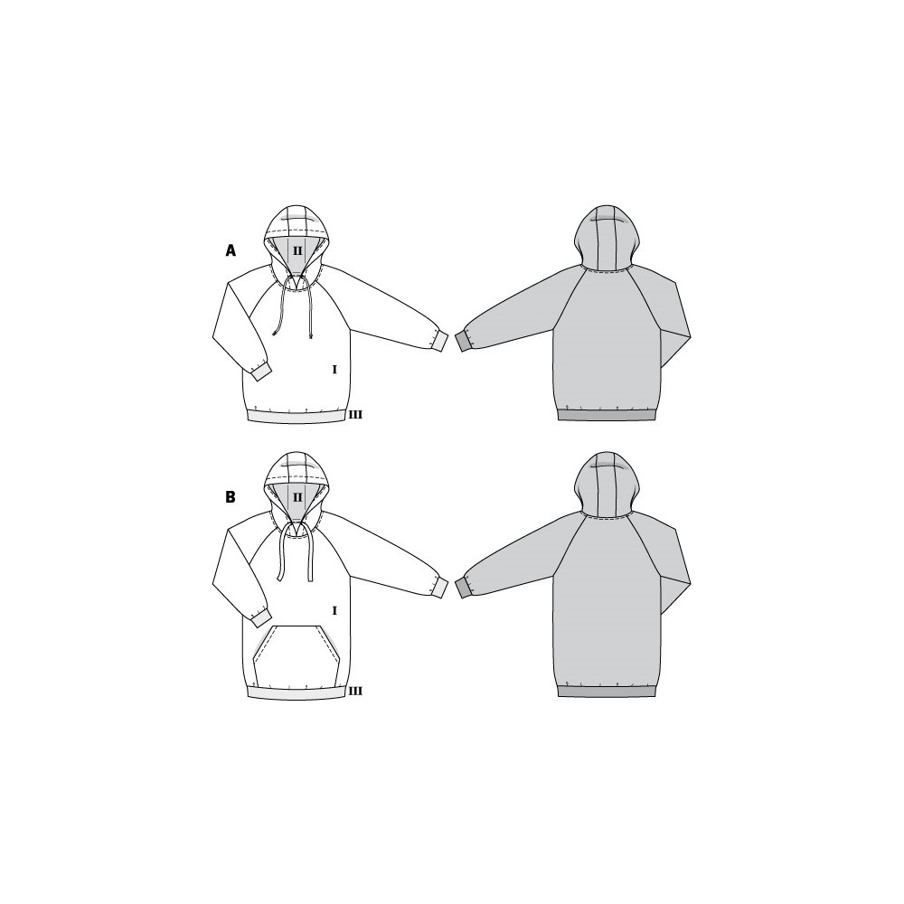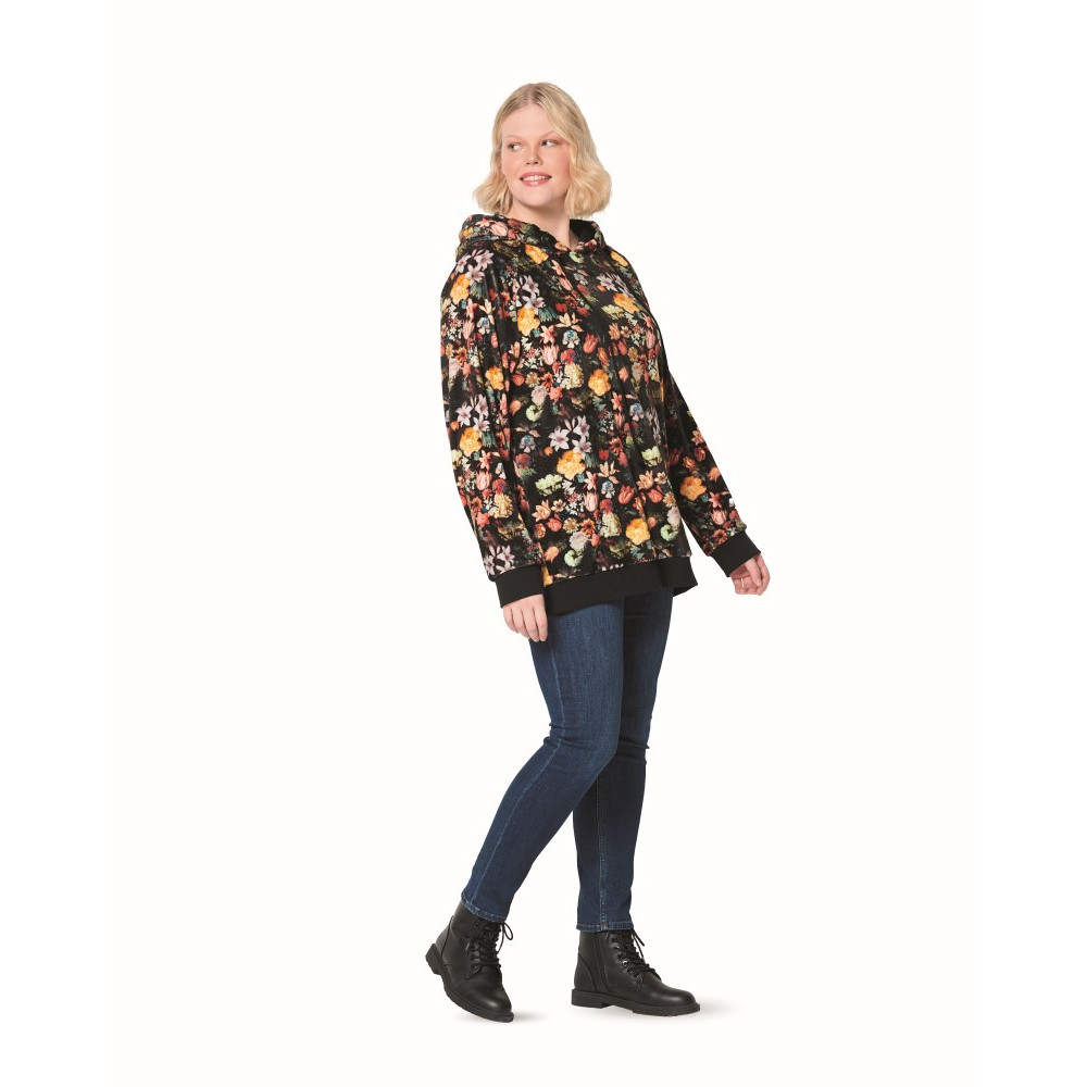 Střih ve velikostech EUR 44/46-56/58, úroveň obtížnosti šití: 2 (lehká), doporučené látky: teplákovina, žerzej