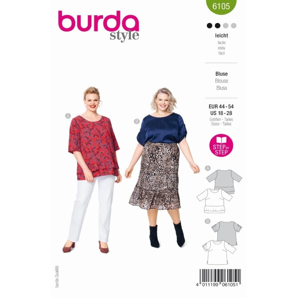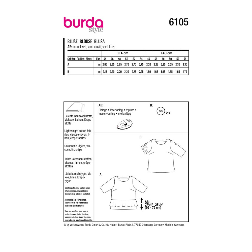 Střih ve velikostech EUR 44-54, úroveň obtížnosti šití: 2 (lehká), doporučené látky: lehčí bavlna, len, viskóza, krepové látky