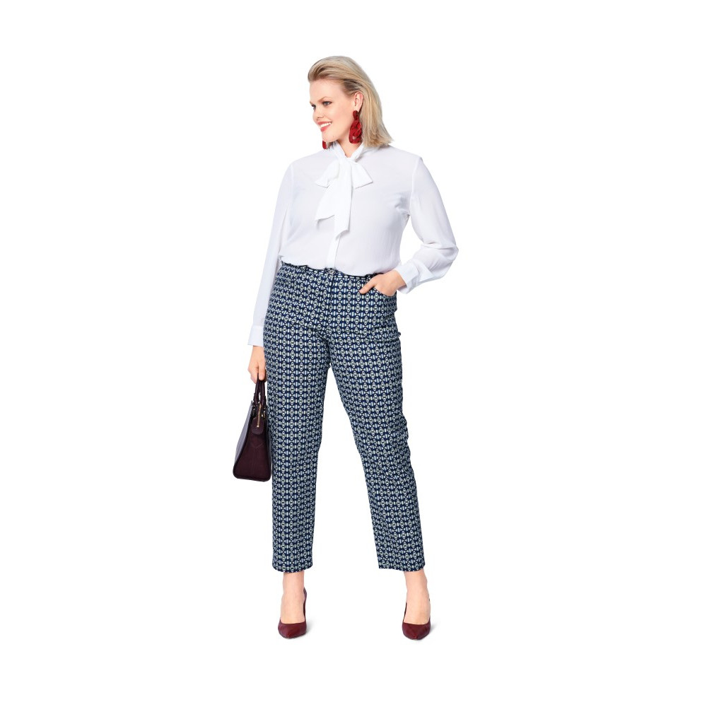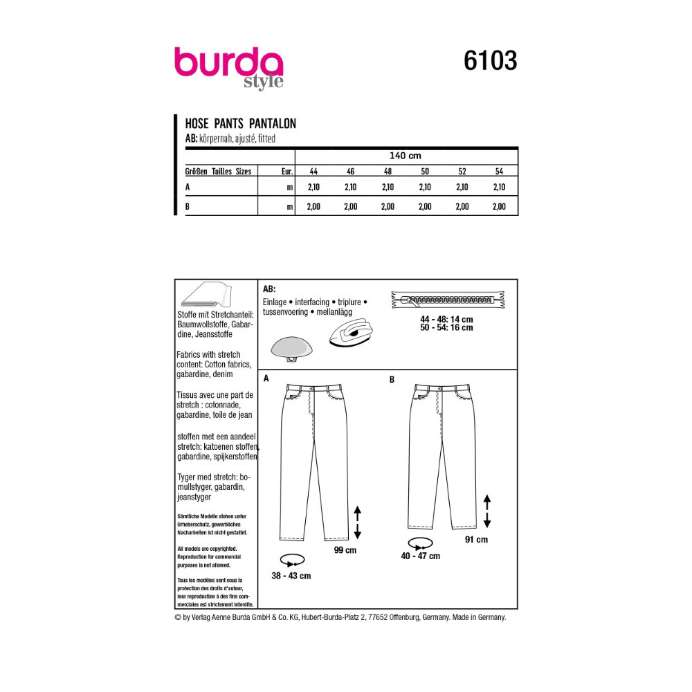 Střih ve velikostech EUR 44-54, úroveň obtížnosti šití: 3 (střední), doporučené látky: látky se strečovým podílem - bavlna, gabardén, džínovina