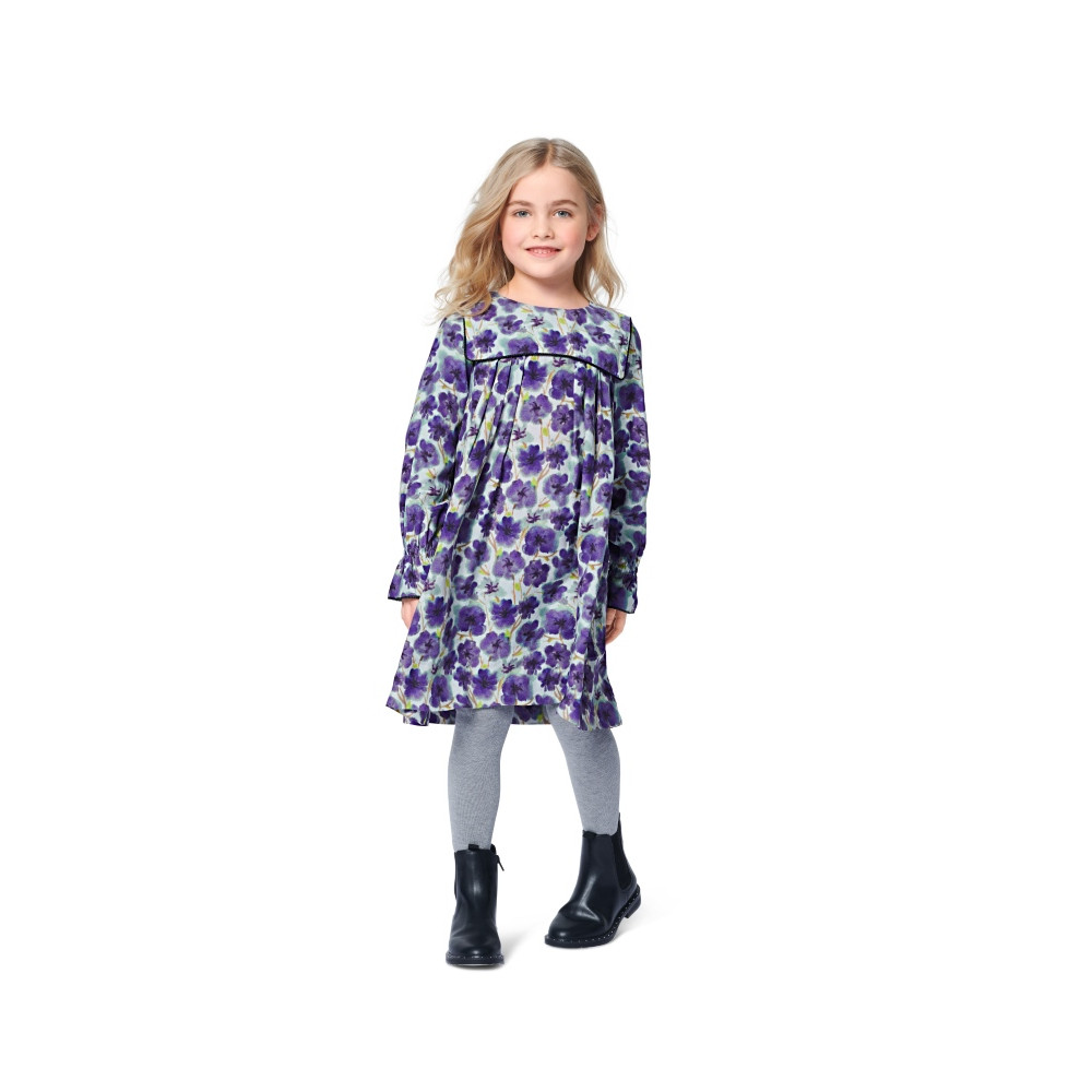 Střih ve velikostech EUR 110-140, úroveň obtížnosti šití: 2 (lehká), doporučené látky: bavlna, viskóza, krep