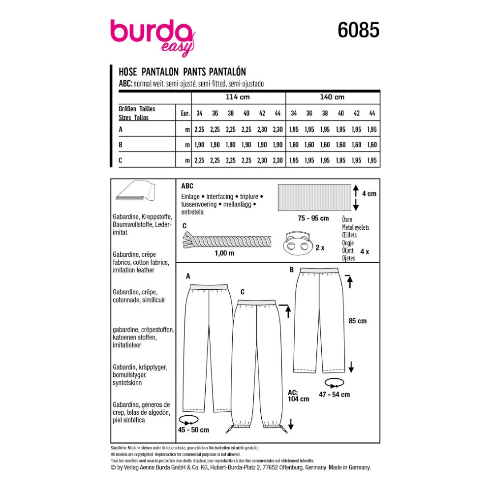 Střih Burda 6085, návod k šití: rovné kalhoty s gumou v pase