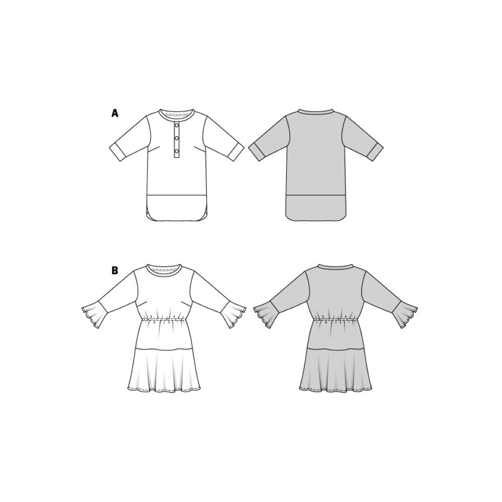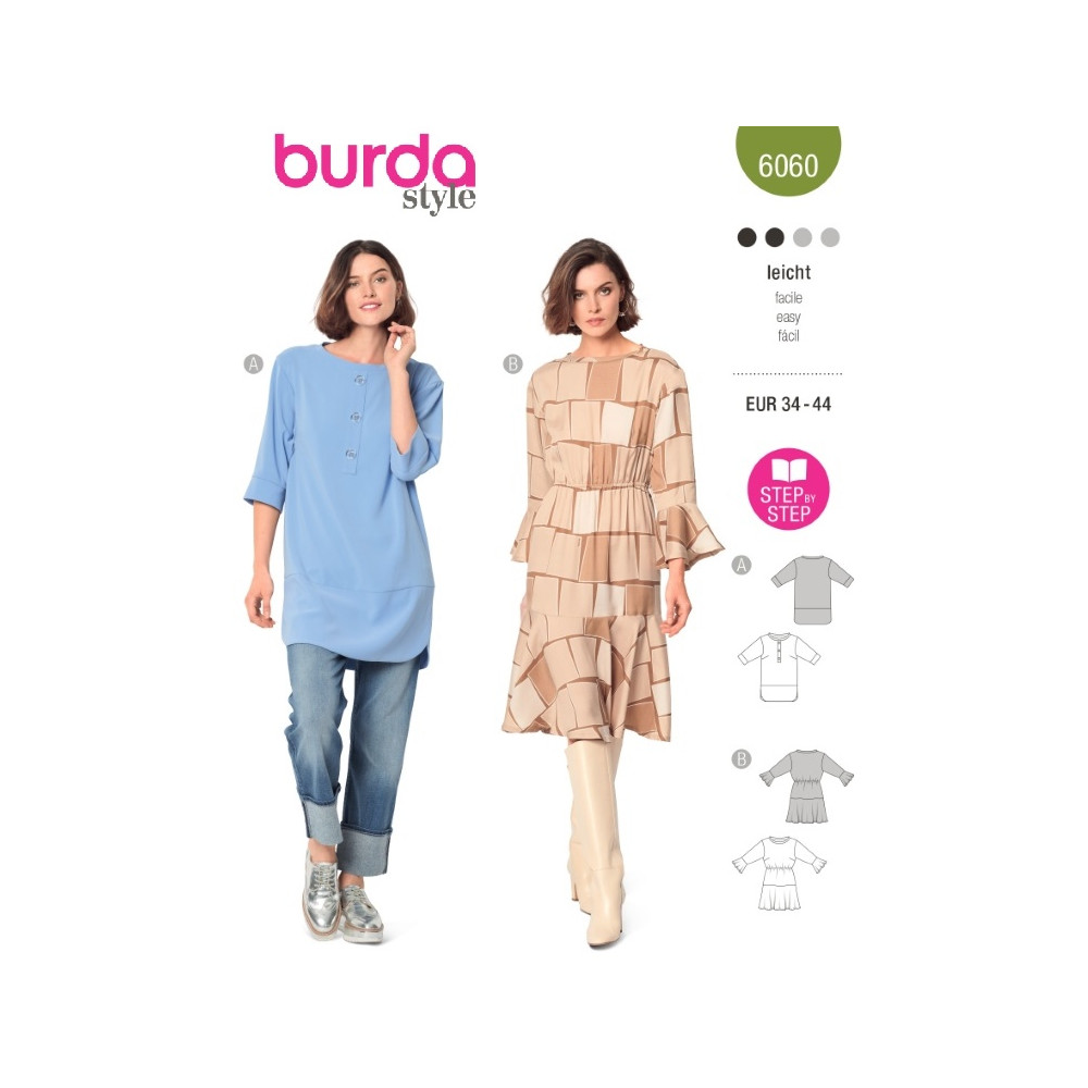 Střih Burda 6060, návod k šití: tunika, šaty s volány