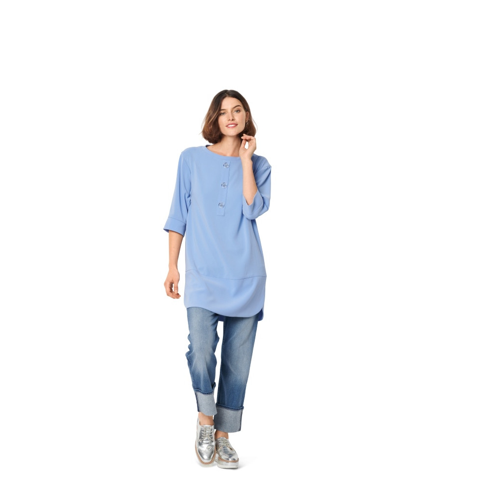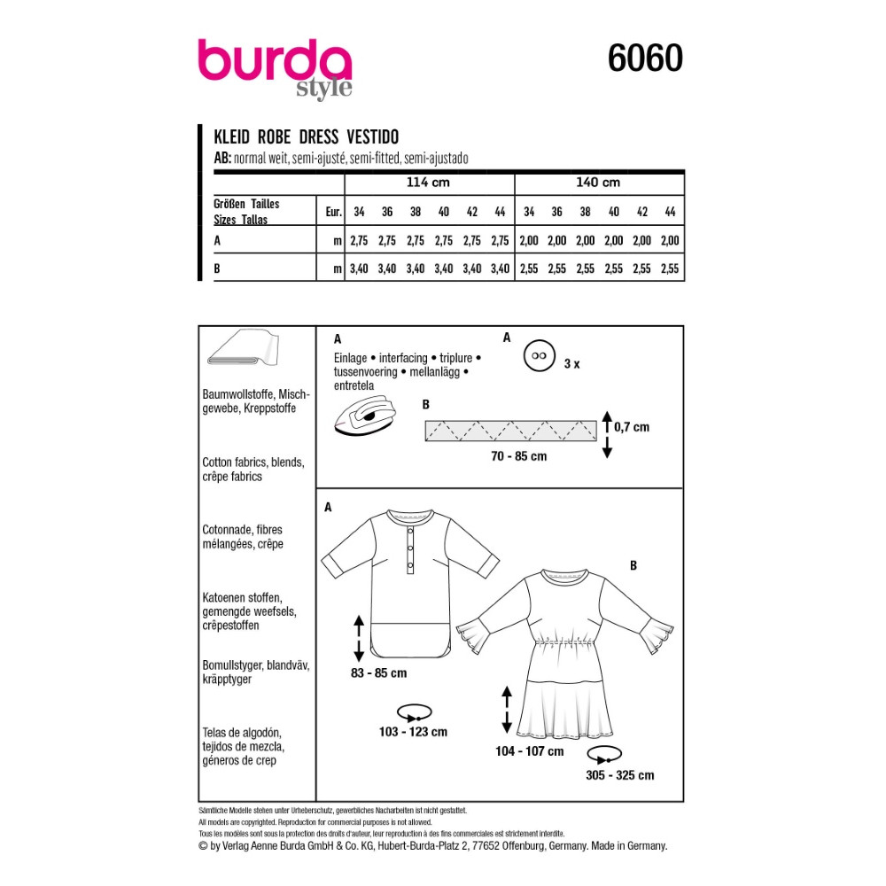 Střih ve velikostech EUR 34-44, úroveň obtížnosti šití: 2 lehká info, doporučené látky: bavlna, směsové látky, krep