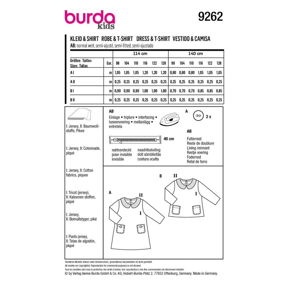 Střih Burda 9262, návod k šití: dívčí áčkové šaty a tričko s límečkem
