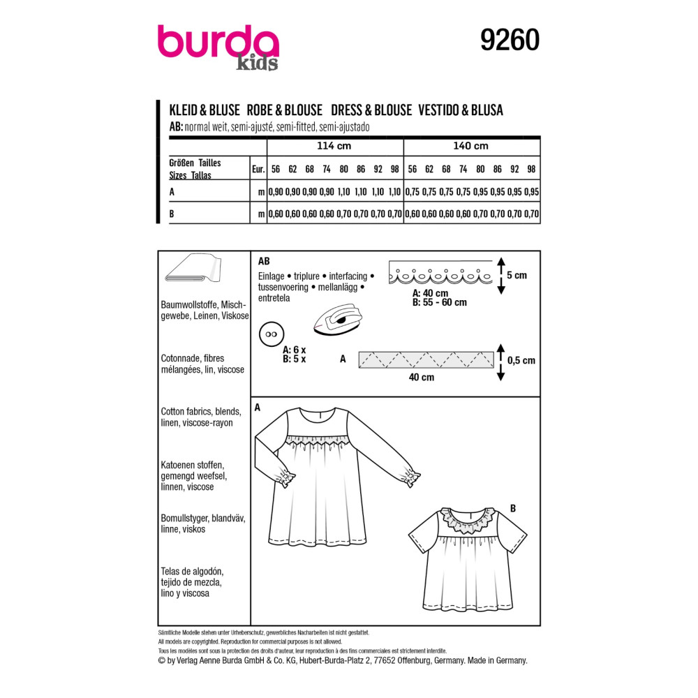 Střih Burda 9260, návod k šití: dívčí nabírané šaty a halenka